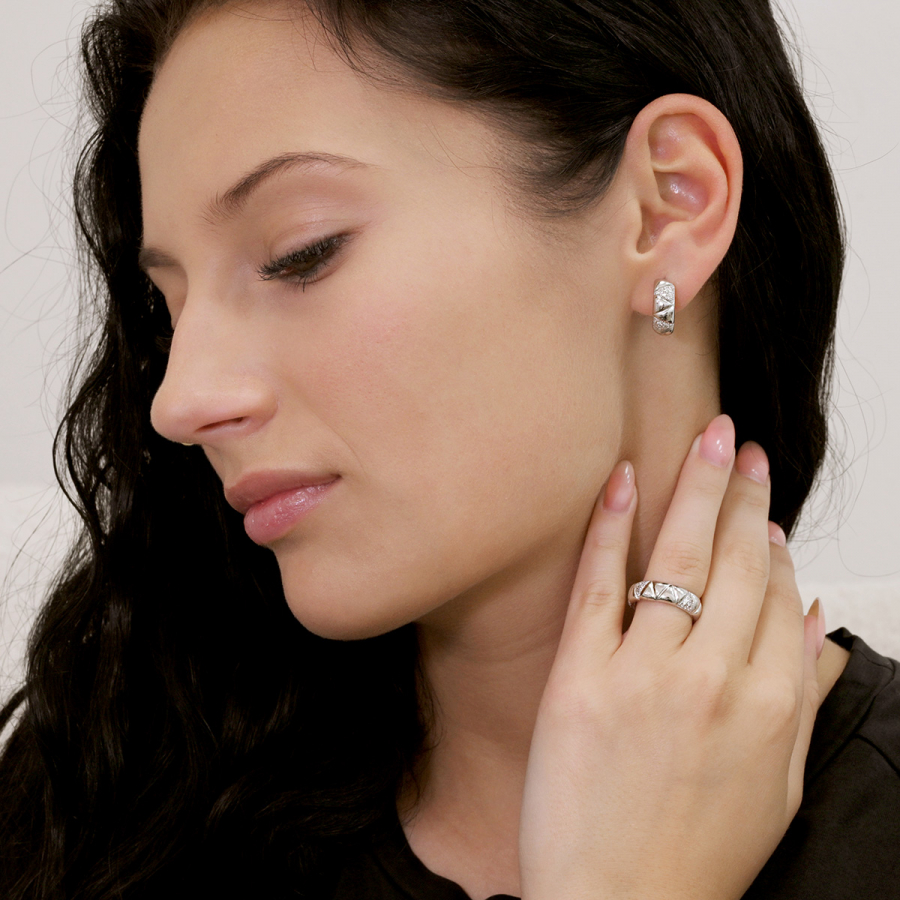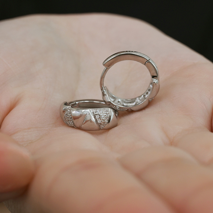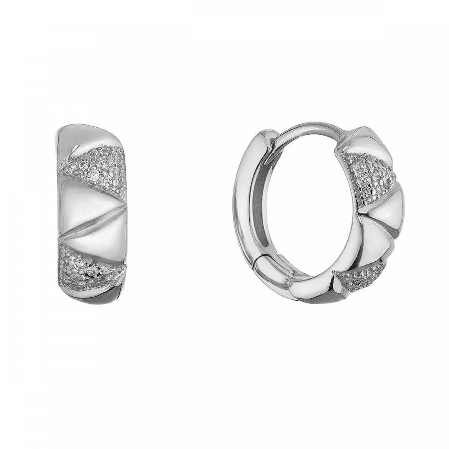Náušnice sú vyrobené zo striebra rýdzosti 925/1000, ktorého povrch je ošetrený vrstvou ródia. Rhodium šperk chráni proti sčerneniu a zaistí jeho dlhotrvajúci lesk. Predná časť kruhov je ozdobená trblietavými zirkónmi. Zapínanie náušníc na spoľahlivý krúžok.