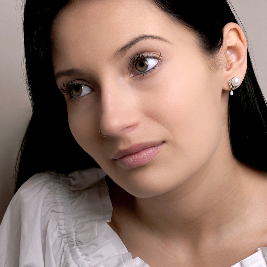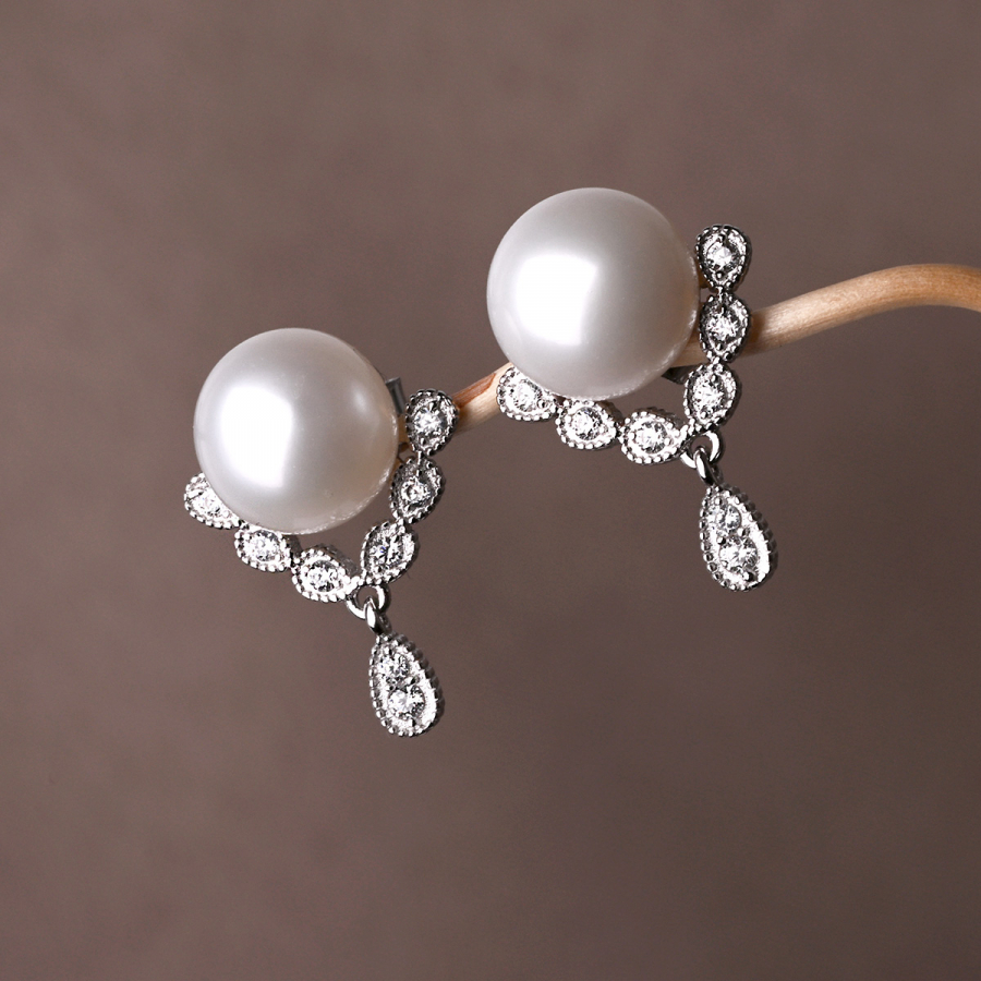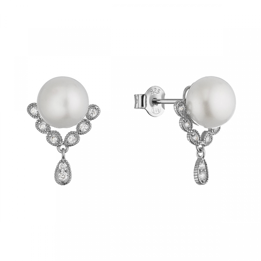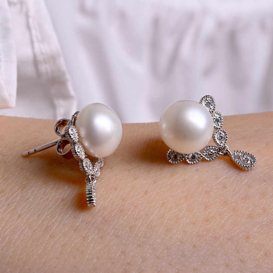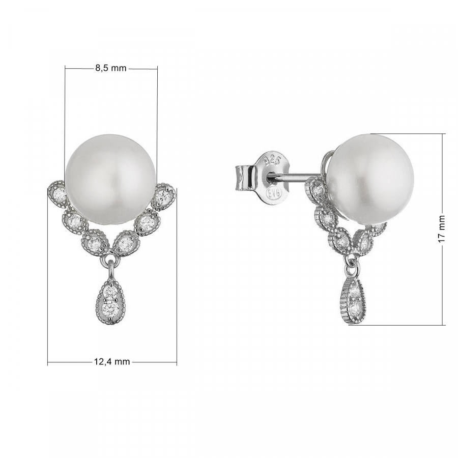Perly kvality AA s priemerom 8,5 mm dodávajú šperku nadčasovú krásu. Pod perlou sa nachádza strieborný trojuholníček so zavesenou kvapôčkou, zdobený zirkónmi, čo dodáva náušniciam jedinečný vzhľad.