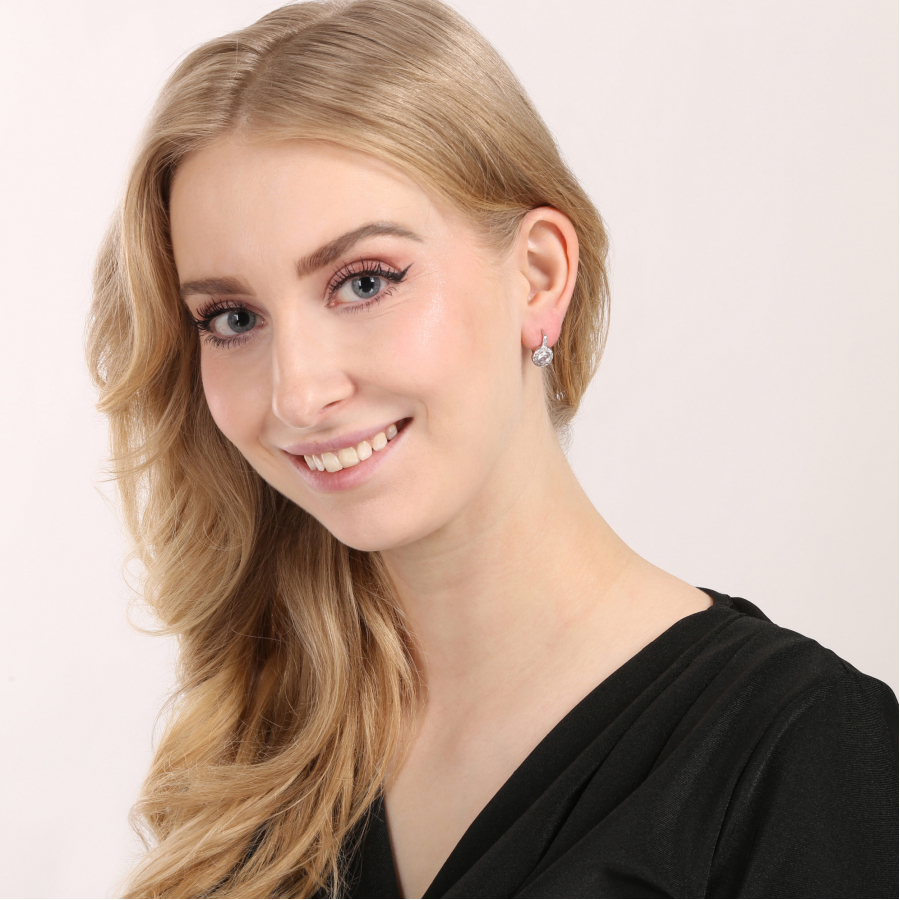 Dominantou šperku je centrálne zasadený číry zirkón vo farbe crystal , ktorý je lemovaný drobnými čírymi kamienkami po celom obvode. Trblietavé detaily pokračujú aj na vrchnej časti náušnice, kde sú vsadené ďalšie tri kamienky, ktoré dodávajú šperku jemný a sofistikovaný vzhľad. Zapínanie na klapku zaisťuje pohodlné a bezpečné nosenie.