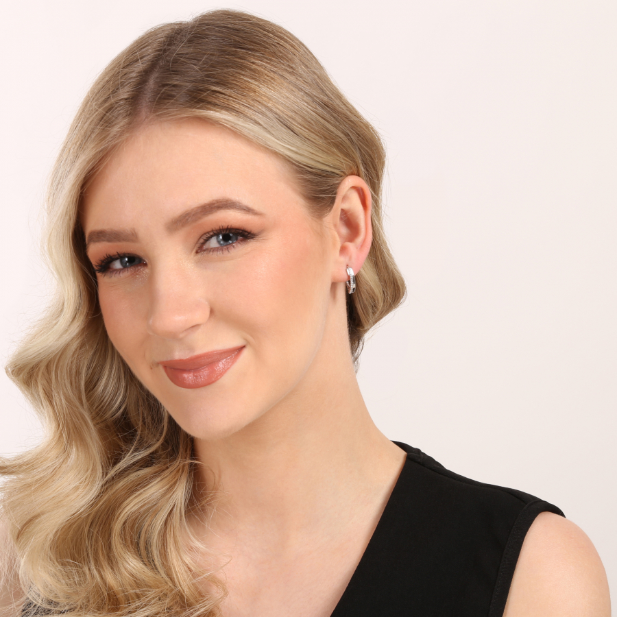 Náušnice majú jedinečný tvar polkruhu tvorený obdĺžnikom, ktorý sa na jednej strane zužuje. Jedna strana je hladká, zatiaľ čo druhá je precízne vysadená kamienkami vo farbe crystal, ktoré im dodávajú elegantný a luxusný vzhľad. Majú praktické zapínanie na klapku. Náušnice neobsahujú nikel, a sú preto vhodné pre všetkých. Sú ideálne na akúkoľvek slávnostnú príležitosť, ale aj na každodenné nosenie.