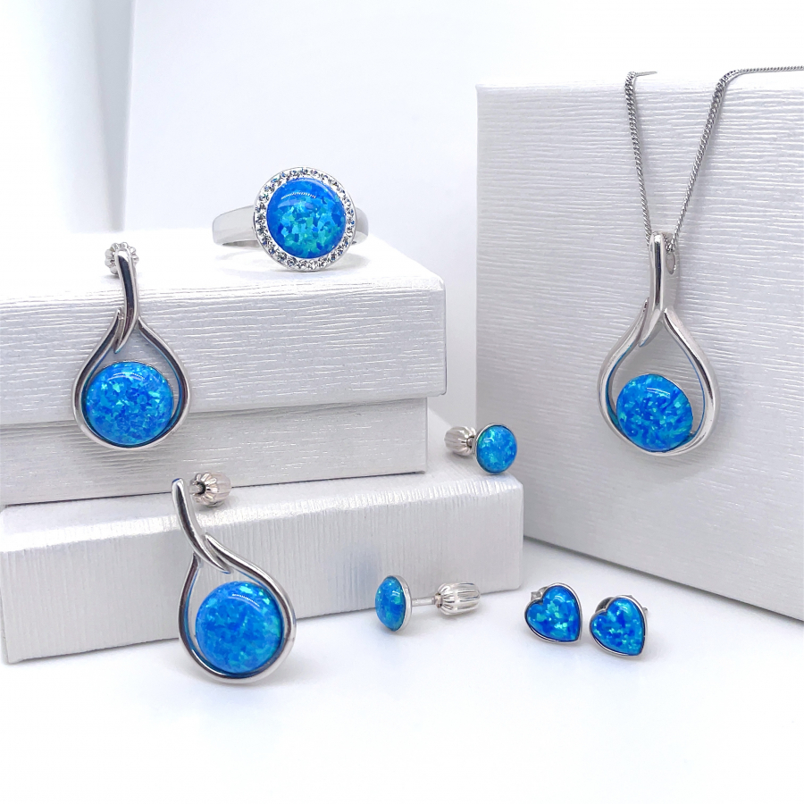 Visiace náušnice tvoríme zo striebra rýdzosti 925/1000 , ktoré je na povrchu upravené ródiom. Vďaka ródiu je šperk odolný proti sčernaniu, zožltnutiu alebo poškriabaniu. Náušnice tvoria jeden okrúhly syntetický opál v modrej farbe, ktorý je zasadený do striebornej kvapky.