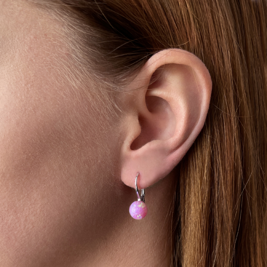 Okrúhle visiace náušnice tvoríme zo striebra rýdzosti 925/1000, ktoré je upravené ródiom. Vďaka ródiu je šperk odolný proti sčernaniu, zožltnutiu alebo poškriabaniu. Náušnice tvoria jeden okrúhly syntetický opál v ružovej farbe.