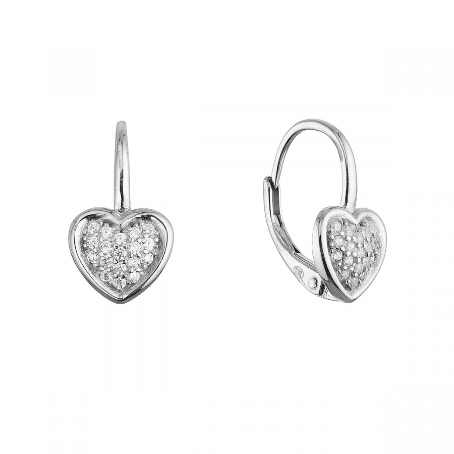 Strieborné visiace náušnice 11647.1 z kvalitného striebra 925/1000 s ródiovou úpravou očarí jemným romantickým dizajnom v tvare srdca. Vnútri každého srdca sú precízne vsadené drobné kamienky vo farbe kryštál, ktoré celej náušnici dodávajú decentný ligot a elegantný vzhľad.