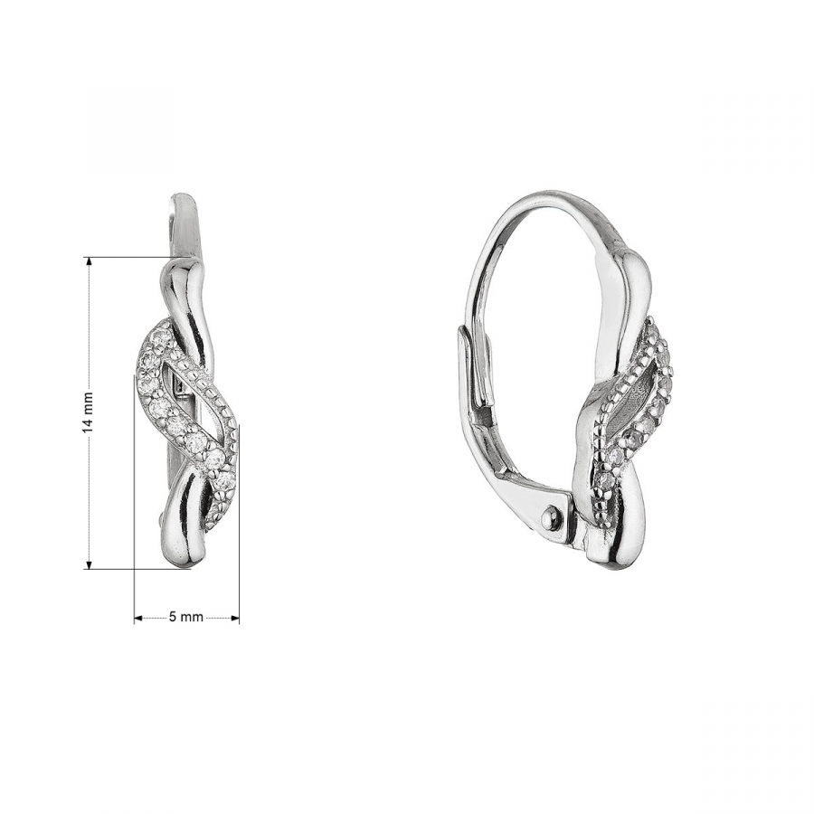 Strieborné visiace náušnice 11671.1 s rýdzosťou 925/1000 a ródiovou úpravou zaujmú svojim originálnym dizajnom inšpirovaným ladným pohybom vĺn. Náušnice tvoria dve nadväzujúce časti – prvá jednoduchá vlna vedie vodorovne, zatiaľ čo druhá, dynamickejšia, sa v polovici rozdvojuje do dvoch samostatných línií, ktoré sa neskôr znovu spájajú. Každá vlnka je vysadená precízne brúsenými čírymi kamienkami vo farbe crystal rôznych veľkostí, čo vytvára efektnú hru svetla a dodáva šperku luxusný ligot.