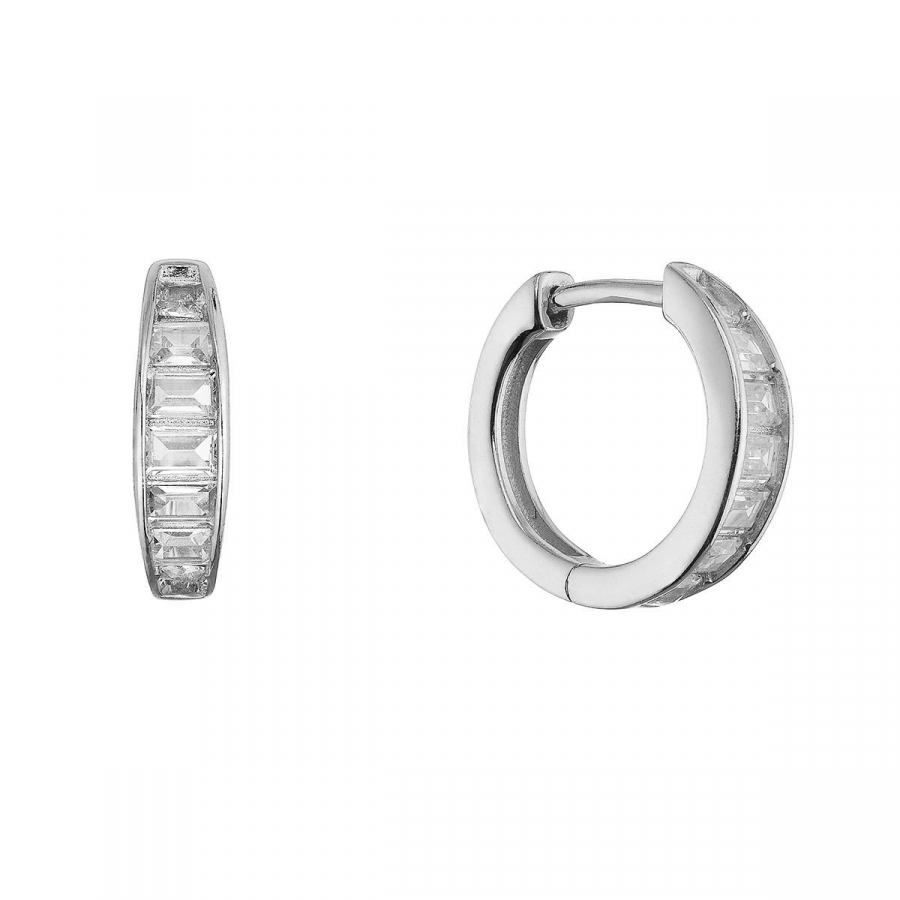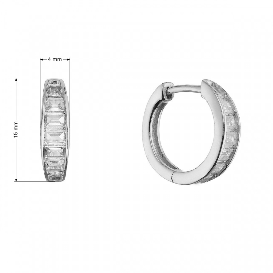 Kruhové náušnice sú precízne spracované zo striebra rýdzosti 925/1000 s ródiovou povrchovou úpravou, ktorá zaistí dlhotrvajúci lesk a odolnosť. Kruhy sú vysadené zirkónmi brúsenými do obdĺžnikového tvaru zvaného baguette . Tento elegantný brus vyniká čistými líniami a krásne odráža svetlo, takže náušnice pôsobia luxusne. Zapínanie na krúžok zaistí pohodlné a spoľahlivé nosenie.