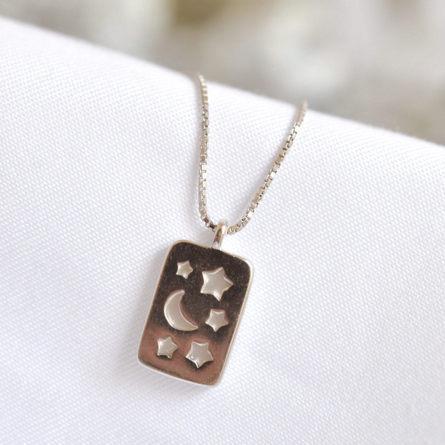 A práve prívesok robí tento šperk výnimočným – je totiž obojstranný . Z jednej strany vás očarí čistá krása bielej perlete, zatiaľ čo druhá strana odhalí detailne prepracovaný motív nočnej oblohy s hviezdami, vyrytý do lesklého kovu. Jediný šperk, dva jedinečné štýly - stačí len otočiť.