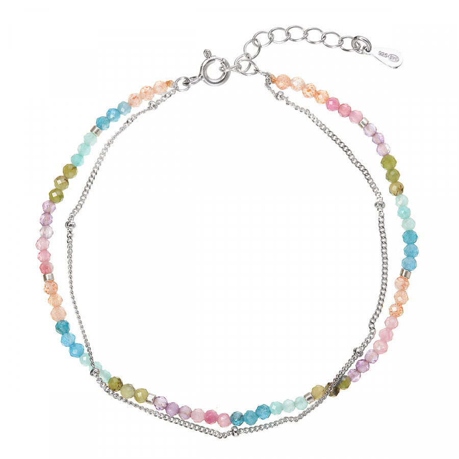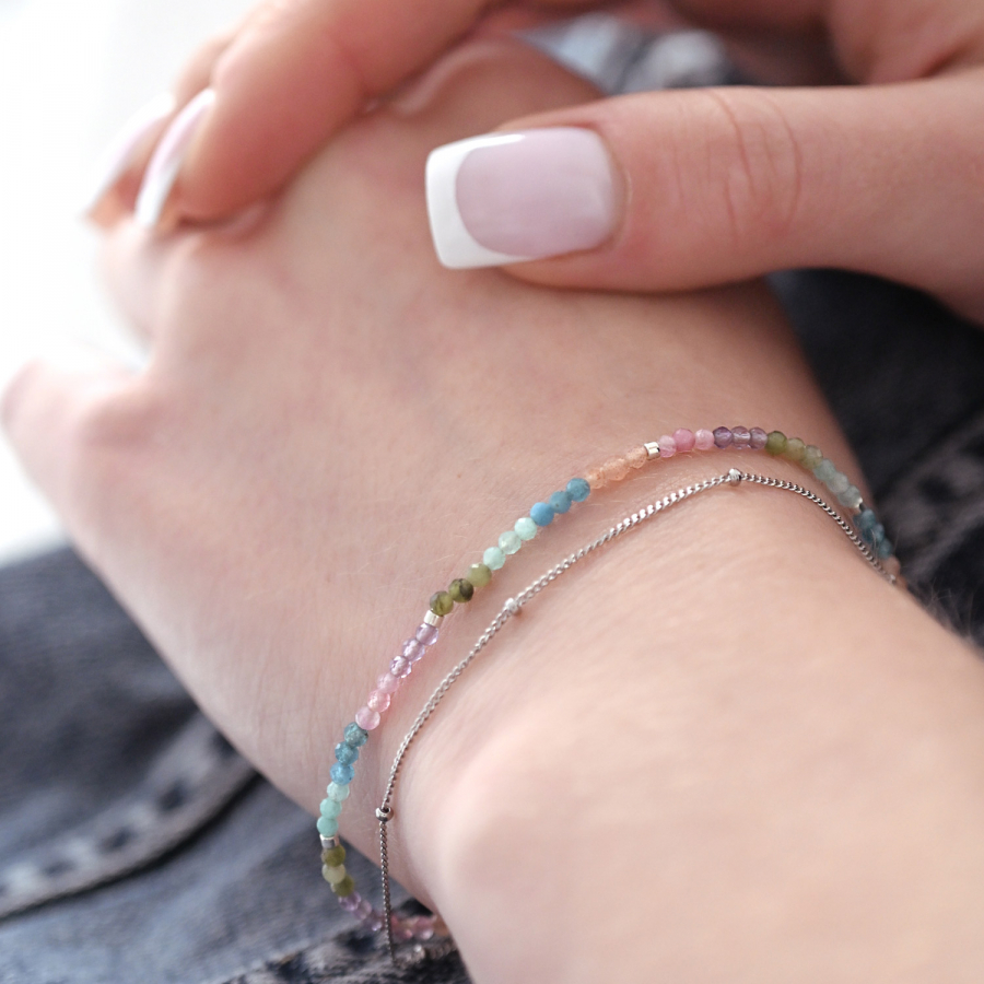 Tento hravý a elegantný dvojitý náramok kombinuje jemnú rhodiovanú striebornú retiazku s líniou drobných korálikov z pravých prírodných kameňov v pestrej farebnej palete. Nájdete medzi nimi tóny ružovej, oranžovej, zelenej i modrej – každá korálka je originál a spoločne vytvárajú veselý, svieži a ľahko bohémsky vzhľad.