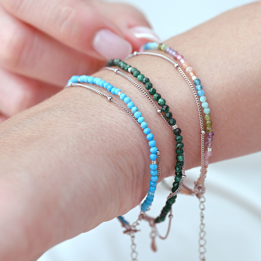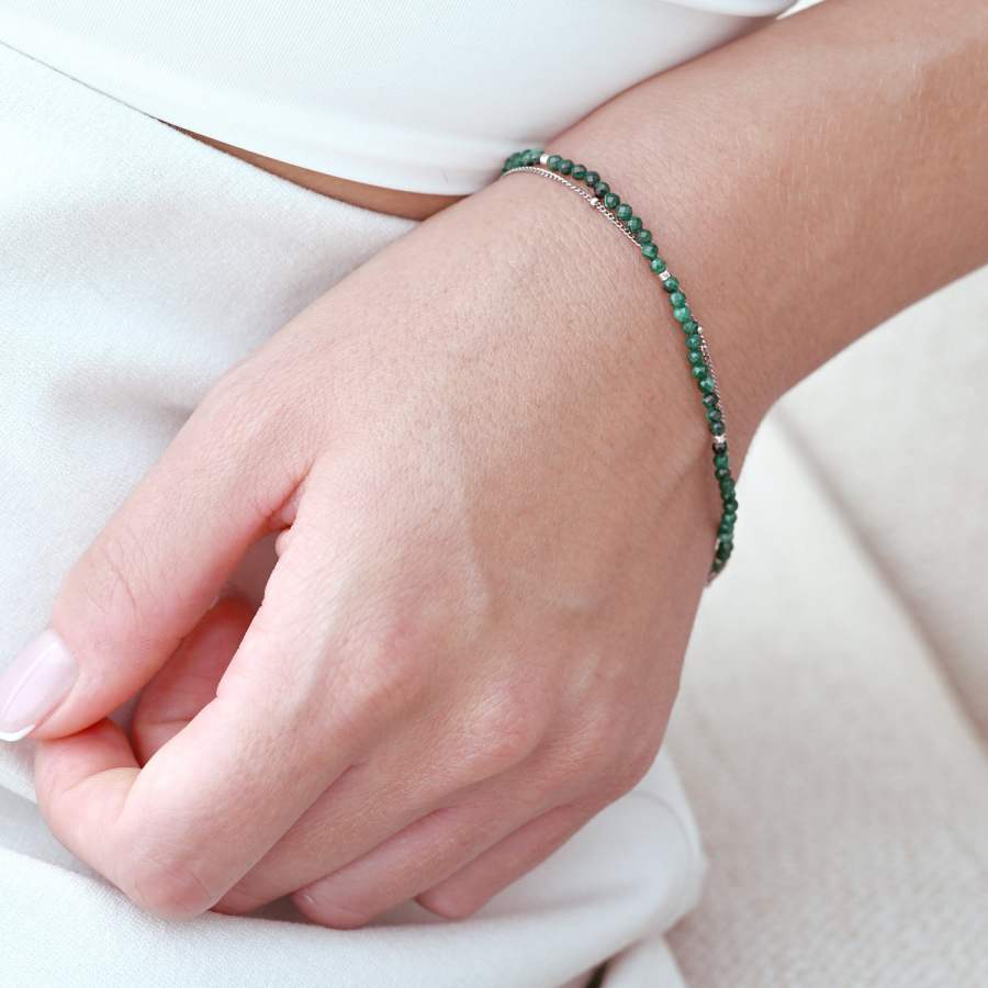 Tento elegantný dvojitý náramok kombinuje jemnú striebornú retiazku s líniou drobných brúsených korálikov zo zeleného malachitu. Sýto zelené tóny malachitu krásne vynikajú vedľa chladivého lesku striebra. Náramok je vyrobený zo striebra rýdzosti 925/1000 s ródiovou povrchovou úpravou, ktorá zaisťuje dlhotrvajúci lesk a ochranu proti sčerneniu. Vďaka zapínaniu na karabínku a adjuste je možné jeho dĺžku upraviť zo 17 cm o ďalšie 4 cm. Jemný, moderný a pritom výrazný šperk na každý deň.