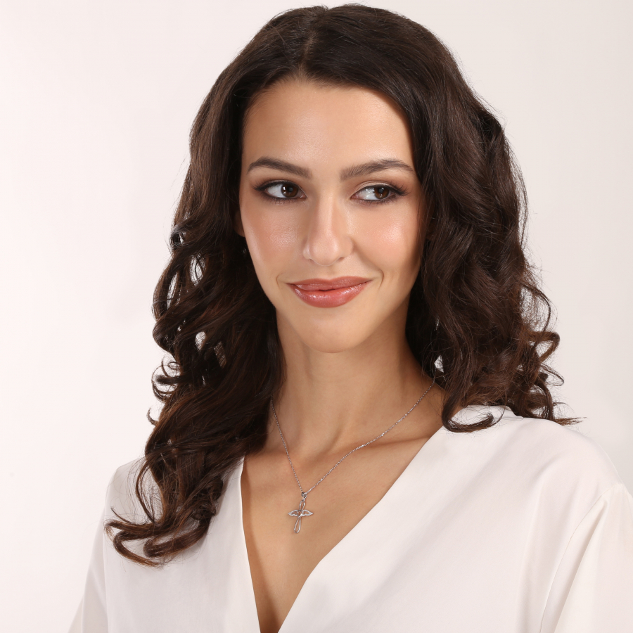 Strieborný náhrdelník s príveskom anjela je krásnym symbolom ochrany a lásky . Prívesok anjela má jemnú a detailnú siluetu, s krídlami zdobenými trblietavými zirkónmi, ktoré dodávajú šperku nadpozemský lesk. Uprostred postavy anjela sa nachádza srdce, symbol lásky a starostlivosti.