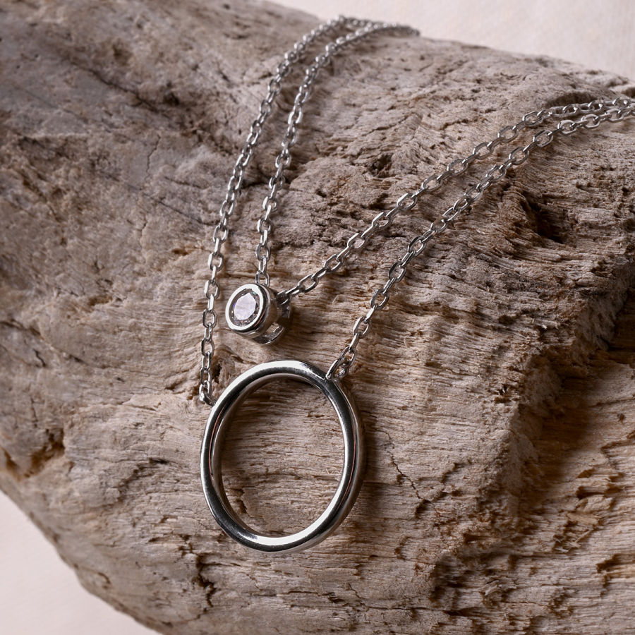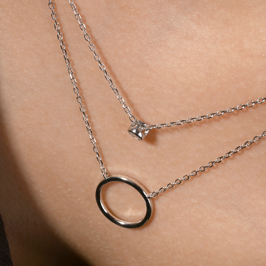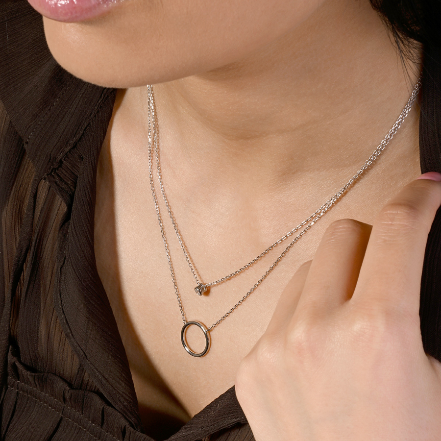 Doprajte svojmu štýlu krehkú eleganciu s týmto pôvabným dvojitým náhrdelníkom. Na jednej retiazke sa hojdá decentný krúžok, zatiaľ čo na druhej retiazke sa blyští prívesok so zirkónom . Táto kombinácia kontrastných tvarov - hladkého kruhu a iskrivého zirkónu - vytvára očarujúcu harmóniu.
