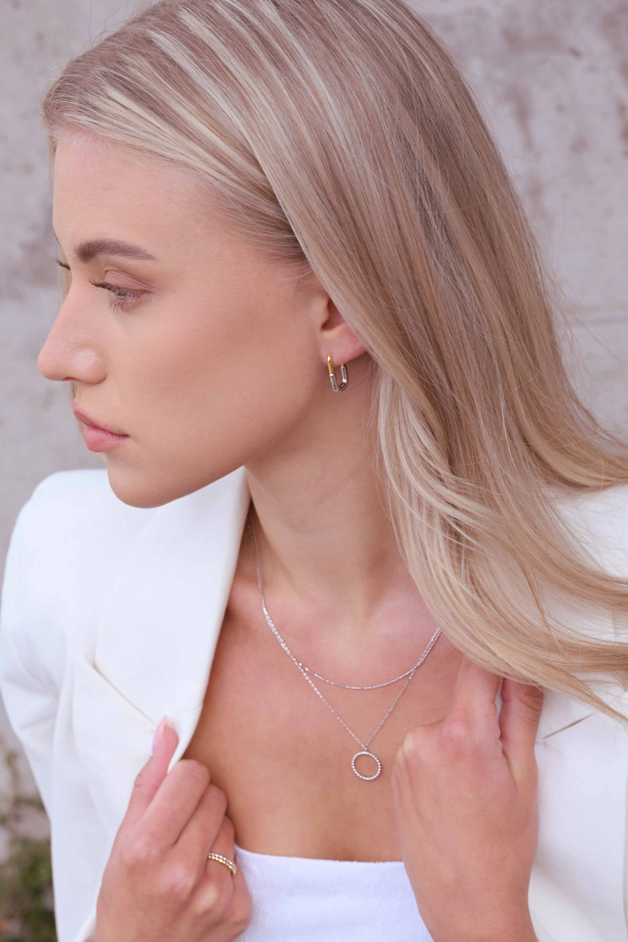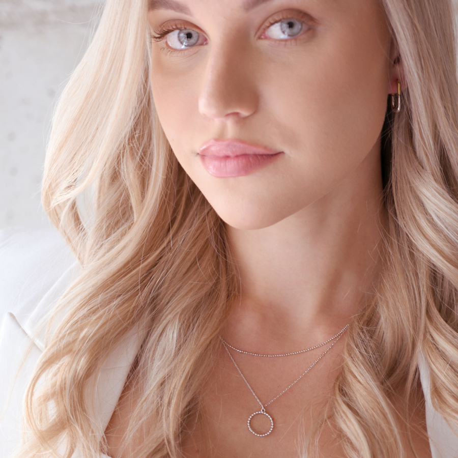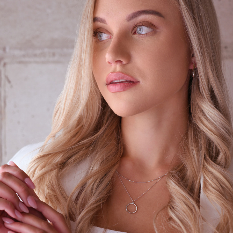 Skladá sa z dvoch delikátnych retiazok, ktoré sa vzájomne prelínajú a tvoria harmonický celok. Na jednej z retiazok žiari jemný krúžok, osadený trblietavými zirkónmi , ktoré zachytávajú svetlo a priťahujú pohľady. Krúžok dodáva náhrdelníku nielen nádych sofistikovanosti, ale aj symboliku večnosti a celistvosti. Tento šperk je dokonalým doplnkom na každú príležitosť, či už ide o slávnostný večer, alebo štýlový doplnok pre všedný deň.