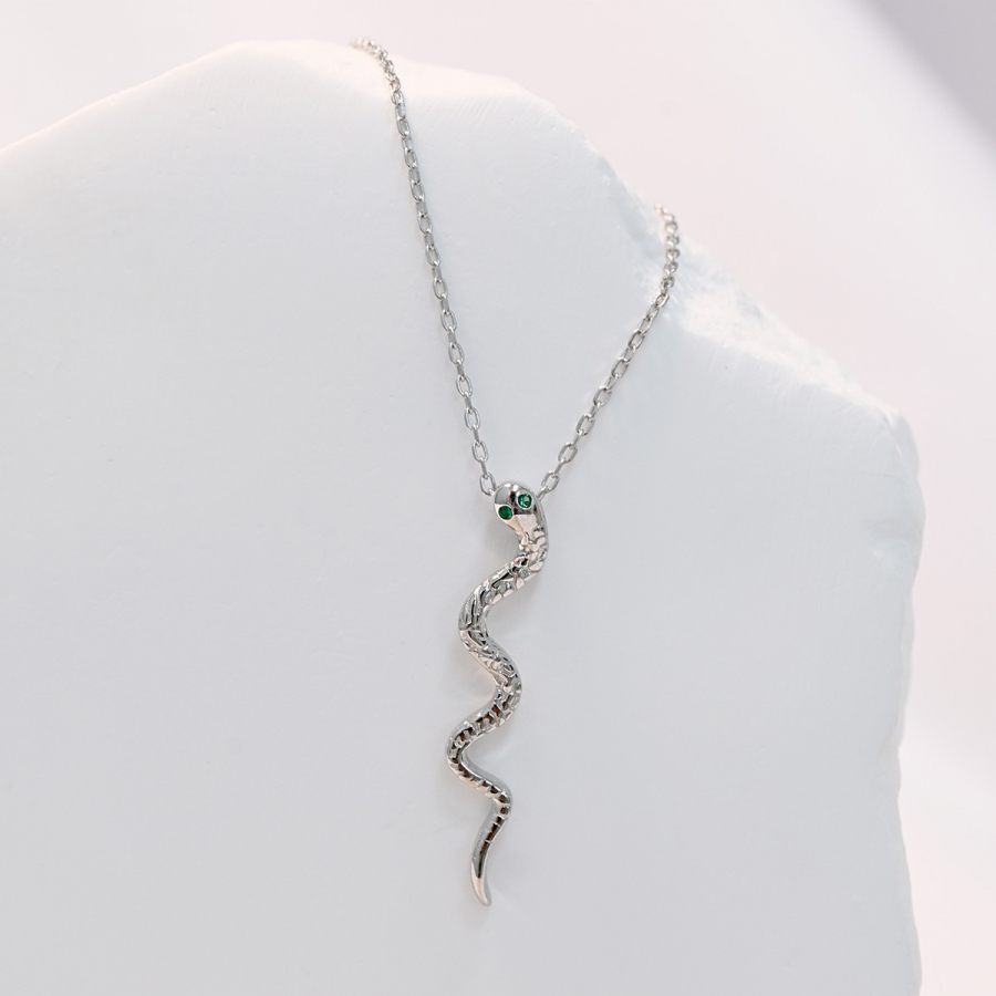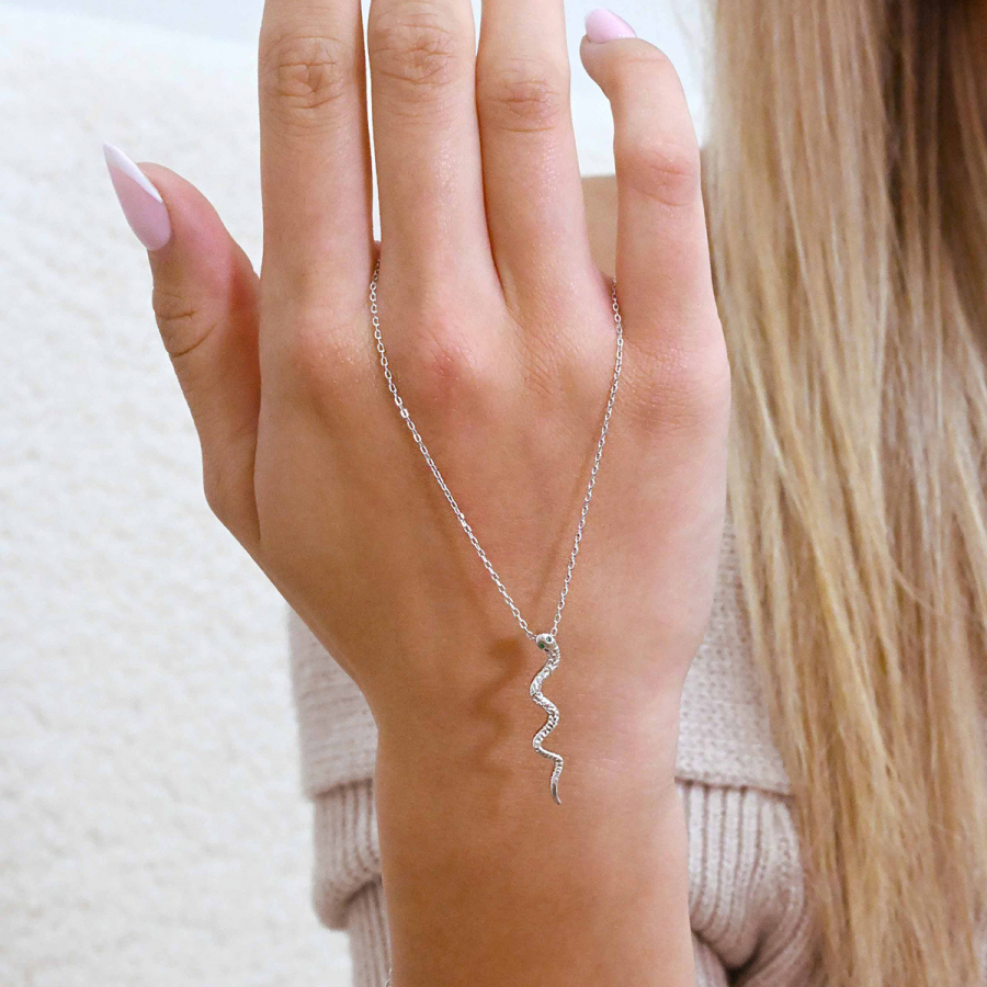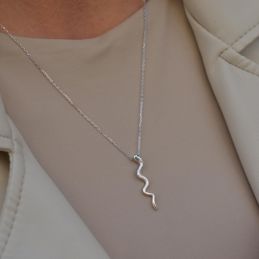 Hadí náhrdelník – symbol sily, múdrosti a transformácie, ktorý vám dodá sebavedomie a tajomný náboj. Tento unikátny šperk je viac ako obyčajný módny doplnok, je to zrkadlo vašej osobnosti. Precízne spracovaný hadí dizajn z rýdzeho striebra je ozdobený nápadito umiestnenými zelenými zirkónmi.