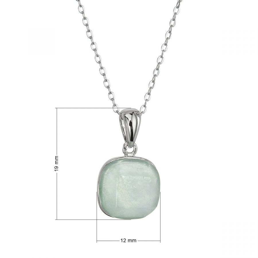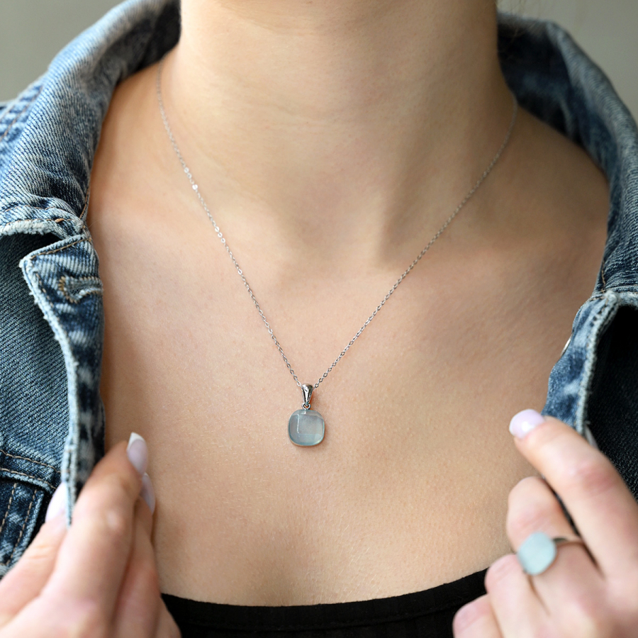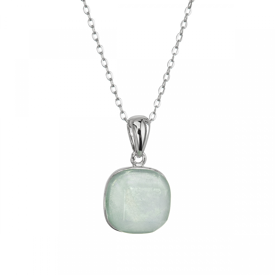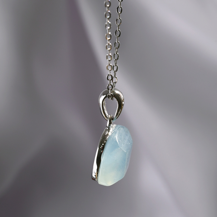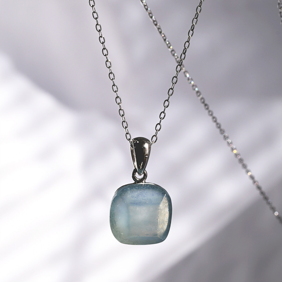 Náhrdelník je vytvorený zo striebra rýdzosti 925/1000 s povrchovou úpravou ródiom, ktorá dodáva šperku čistý a žiarivý lesk. Štvorcový prívesok je zdobený prírodným akvamarínom s charakteristickou ľadovo modrou farbou. Jemné hrany kameňa sú brúsené s mimoriadnou starostlivosťou a vytvárajú krehkú hru svetla, ktorá pripomína ľadové kryštály.