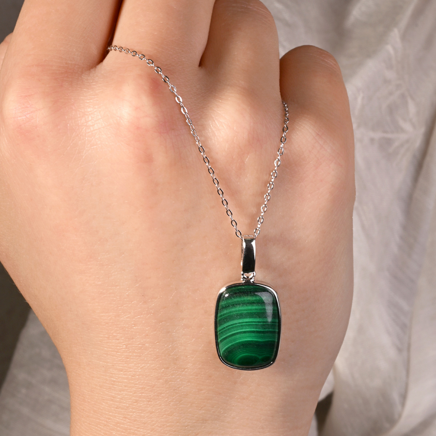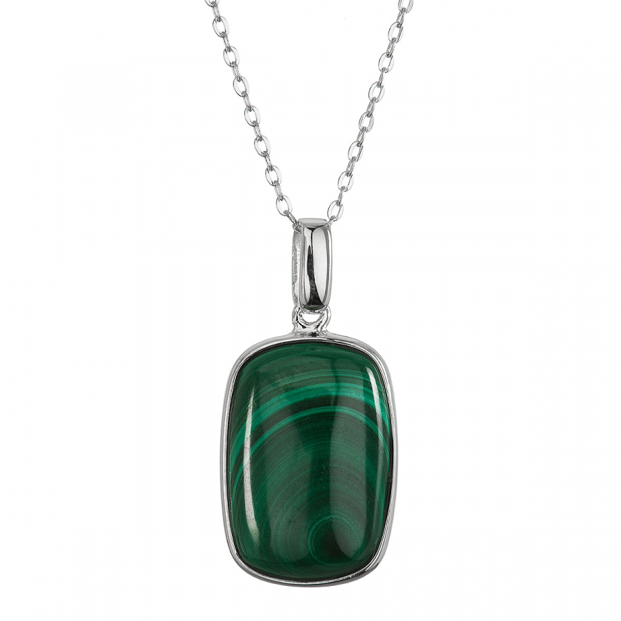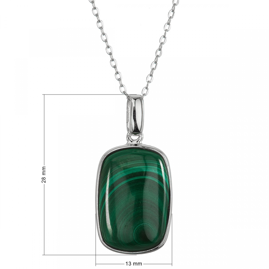 Náhrdelník s príveskom je vyrobený zo striebra rýdzosti 925/1000 s rhodiovanou úpravou, ktorá poskytuje šperku maximálnu ochranu a čistý, žiarivý lesk. Precízne zasadený prírodný malachit s charakteristickou sýto zelenou farbou a unikátnou kresbou zapĺňa obdĺžnikový prívesok. Jemná strieborná linka lemujúca kameň vytvára harmonický a dynamický celok, ktorý zachytáva tajomnú energiu zelených hlbín v jedinom okamihu.