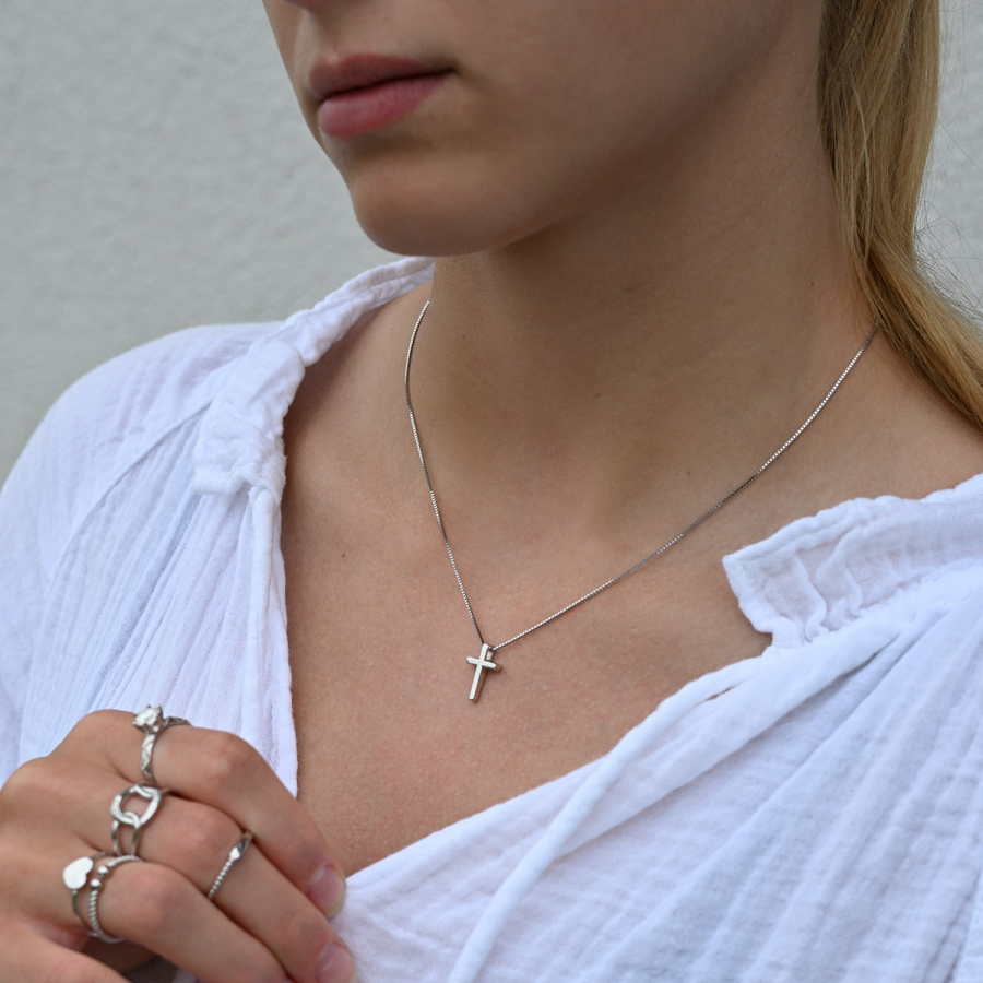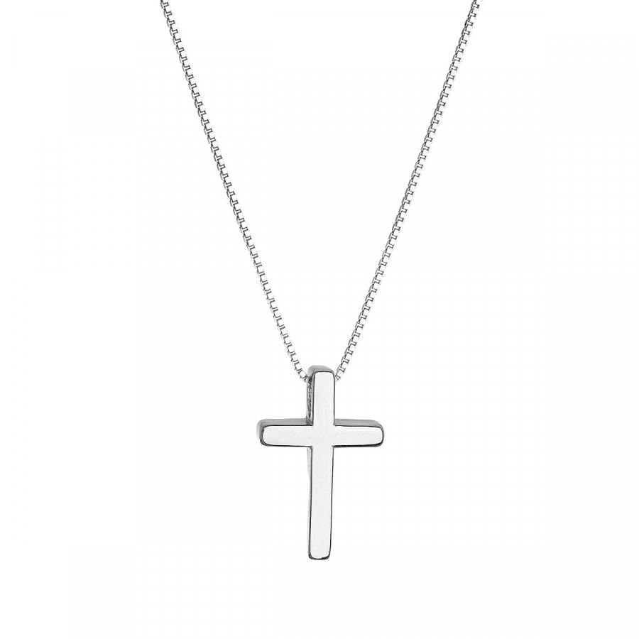 Tradičný náhrdelník v modernom jednoduchom prevedení s príveskom v tvare krížika z lesklého striebra. Retiazka je prevlečená priamo krížikom , takže samotný tvar kríža nenarúša už žiadne očko.