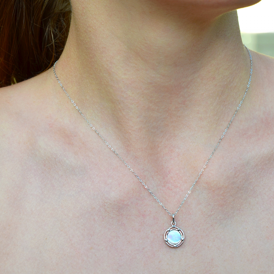 Náhrdelník s príveskom je vytvorený zo striebra rýdzosti 925/1000 s ródiovou úpravou, ktorá poskytuje šperku maximálnu ochranu pred poškriabaním, zožltnutím aj sčernením. Precízne zasadená jemne ružová perleť je nežne obomknutá pozláteným striebrom, čím vytvára dokonalú harmóniu farieb a tvarov. Okrúhly prívesok s perleťou zachytáva premenlivosť svetla - pri každom pohybe hrá jemnými farbami, ktoré očarujú svojou krehkou krásou.