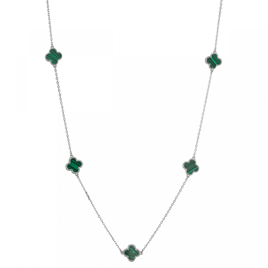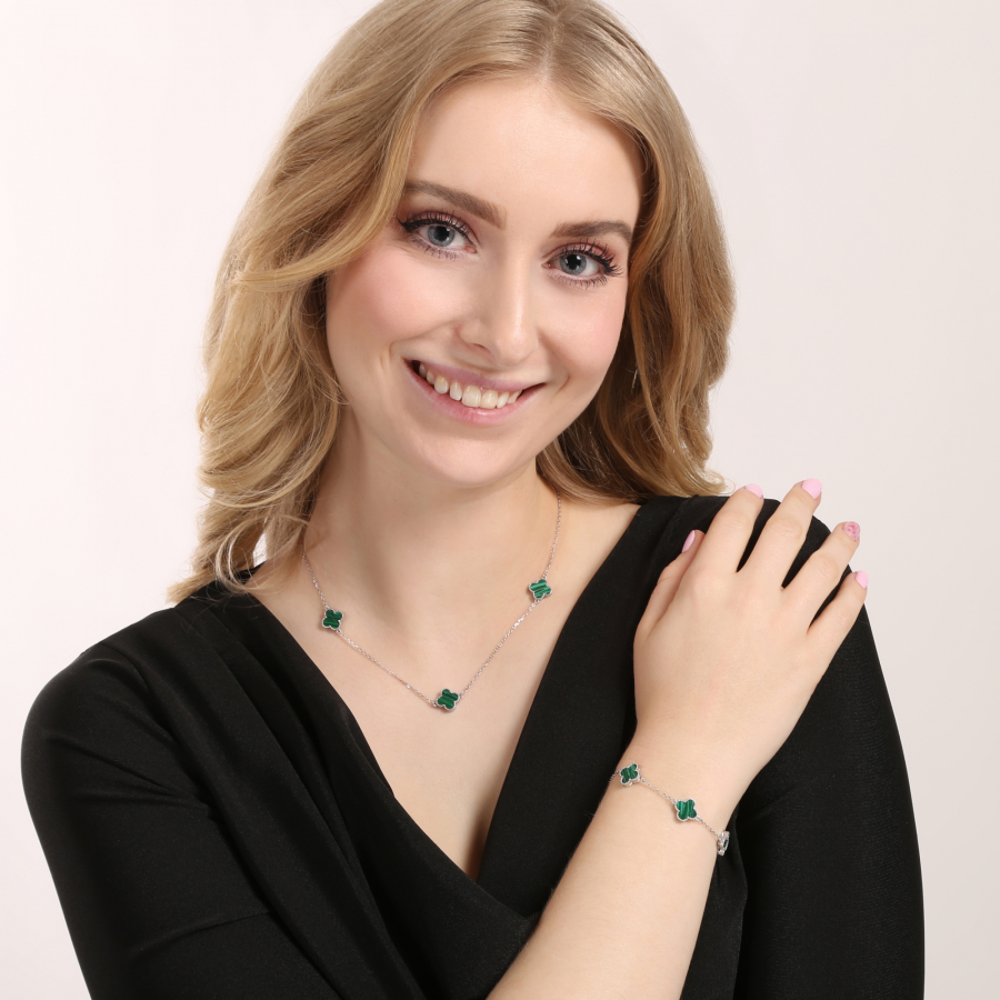 Jemný strieborný náhrdelník s pôvabnými štvorlístkami je symbolom šťastia a nadčasovej elegancie. Každý štvorlístok je vyplnený zeleným malachitom , ktorý dodáva šperku jedinečný a prírodný charakter.