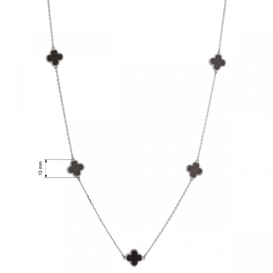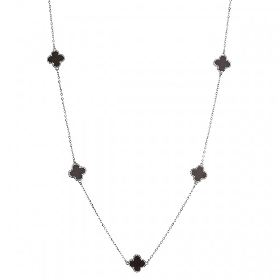 Jemný strieborný náhrdelník s pôvabnými štvorlístkami je symbolom šťastia a nadčasovej elegancie. Každý štvorlístok je vyplnený čiernym pinolitom , ktorý dodáva šperku jedinečný a tajomný charakter.