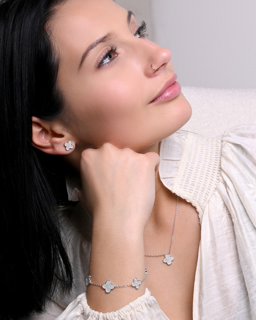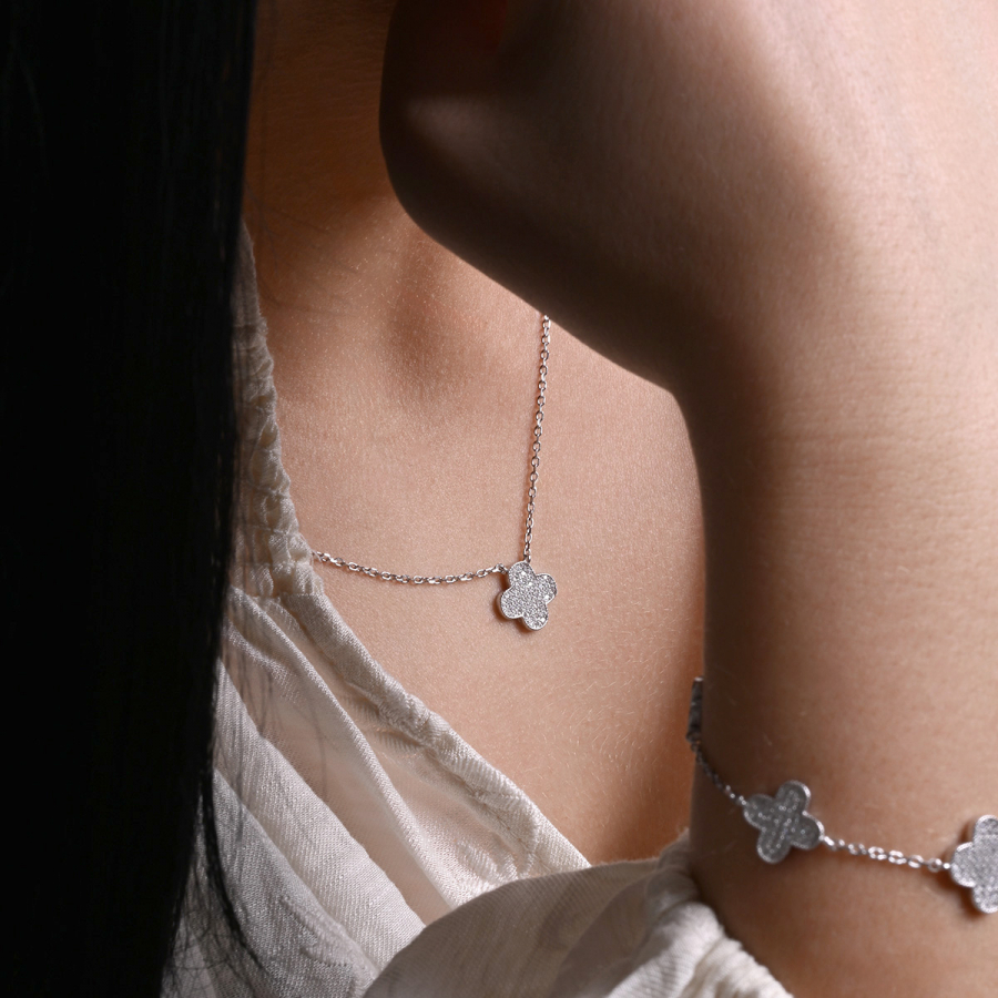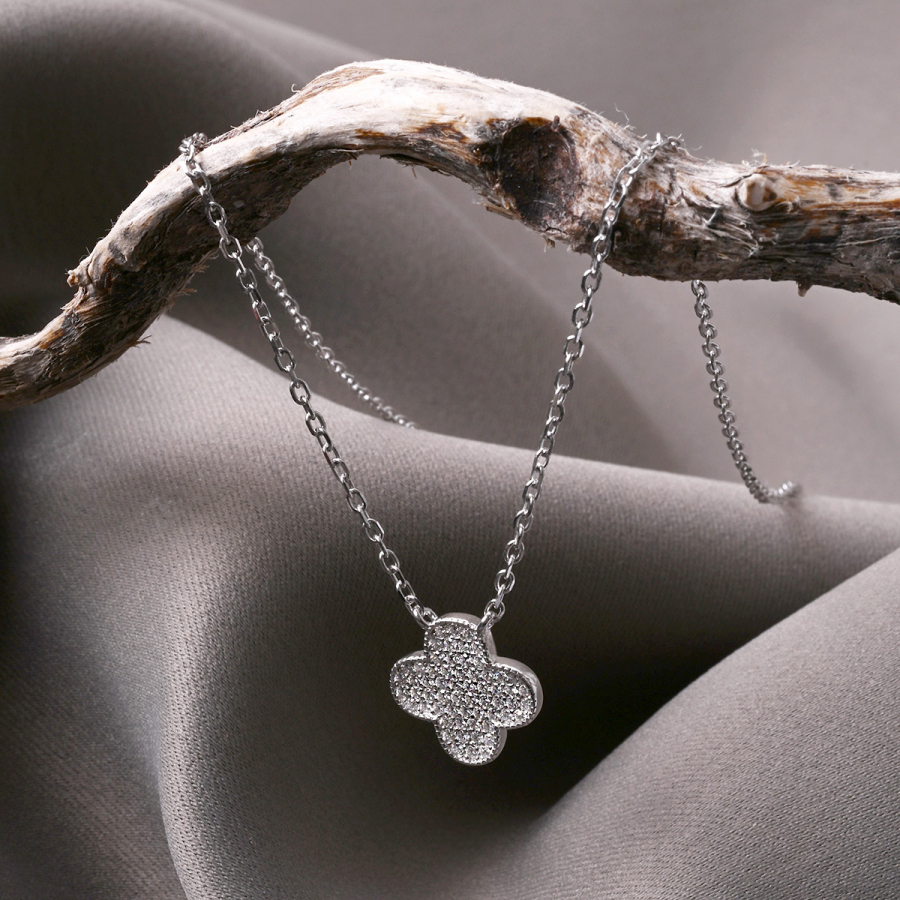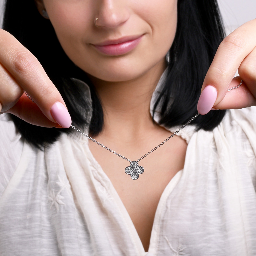 Náhrdelník je precízne spracovaný z rhodiovaného striebra rýdzosti 925/1000, ktoré zaručuje špičkovú kvalitu a trvalý lesk. Každý lístoček štvorlístka je starostlivo vysadený drobnými zirkónmi , ktoré pri najmenšom pohybe rozohrávajú nádhernú hru svetla.