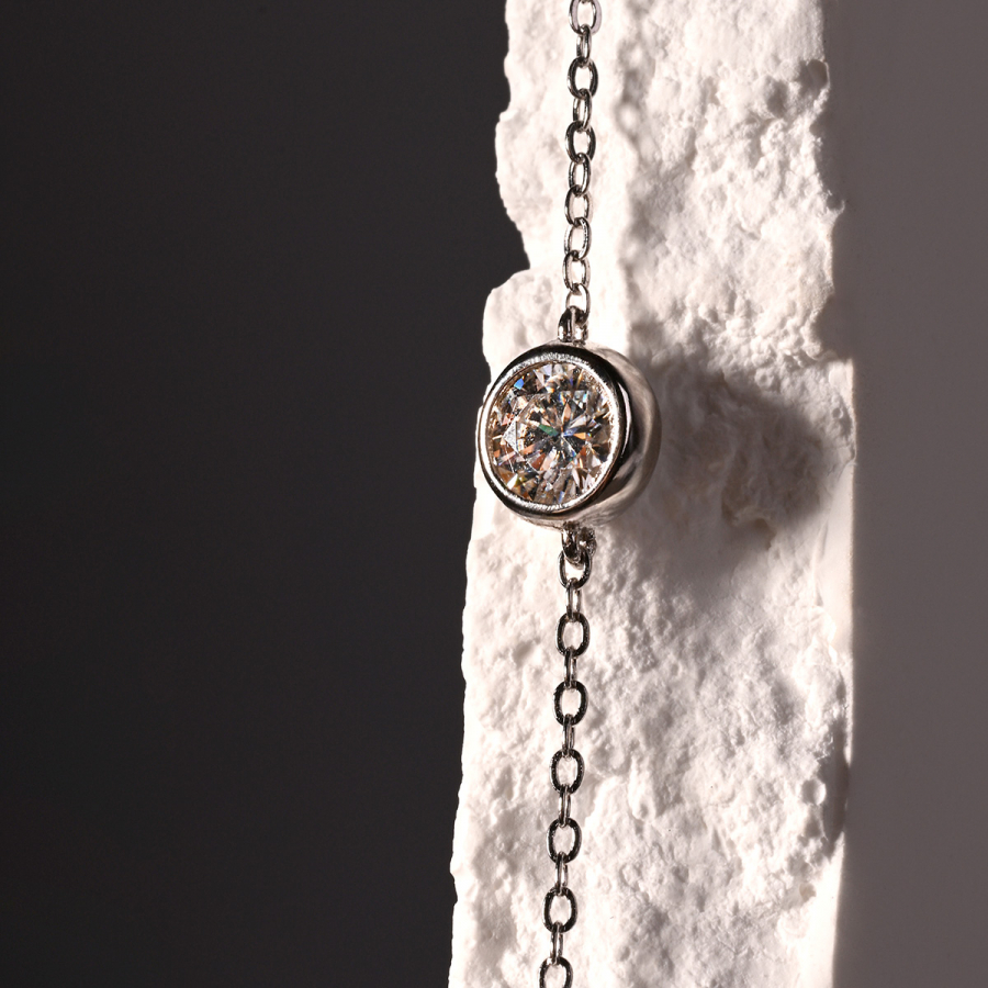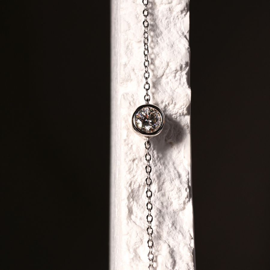 Elegantný strieborný náramok zdobený jedným okrúhlym moissanitom , jedinečný žiarivý klenot na vašom zápästí. Náramok je vyrobený z rhodiovaného striebra rýdzosti 925/1000. Vrstva z bieleho 18 kt. zlata zaisťuje luxusný lesk šperku a jeho dlhotrvajúcu odolnosť. Nastaviteľná dĺžka náramku a pohodlné zapínanie na karabínku z neho robí dokonalý doplnok pre každú príležitosť.