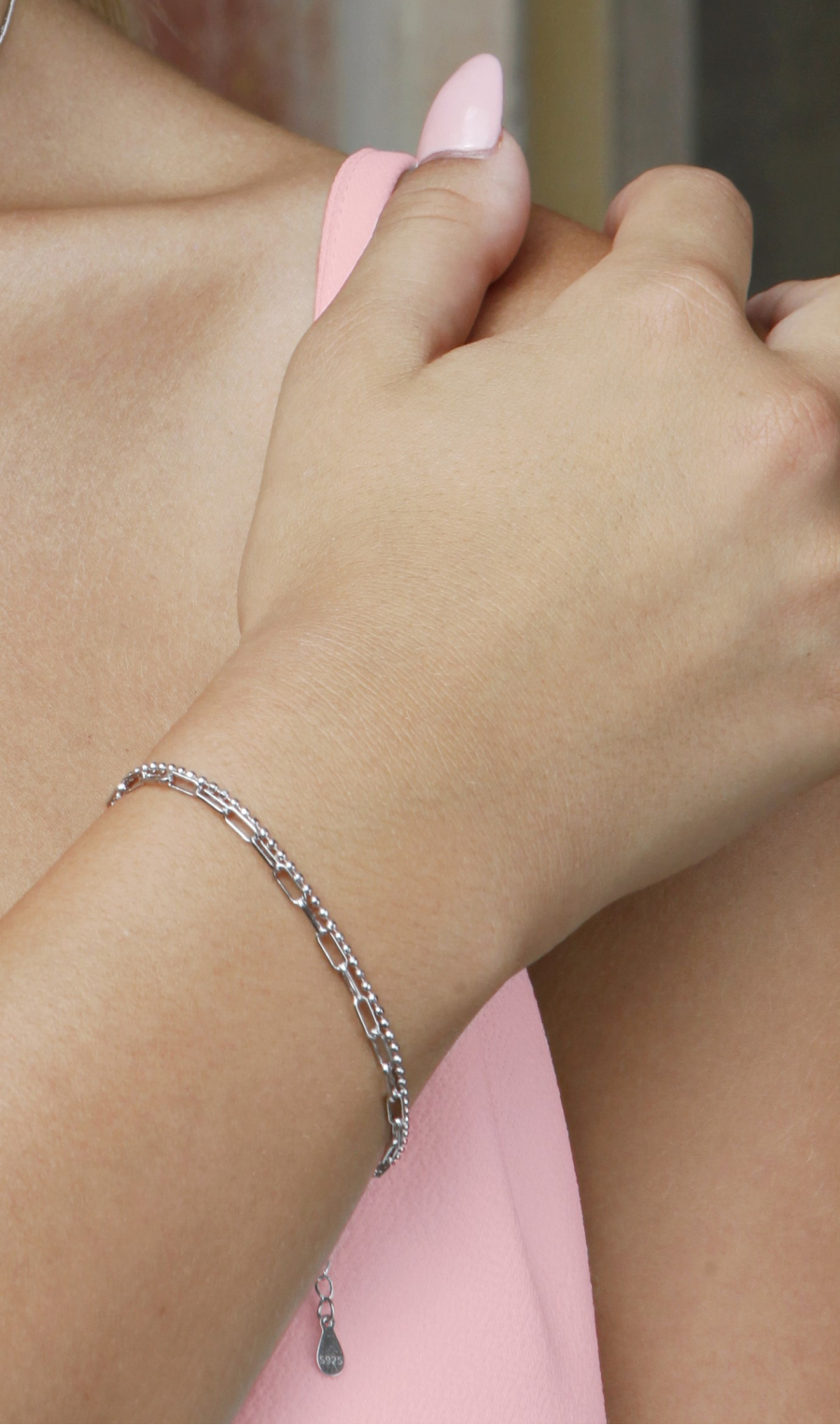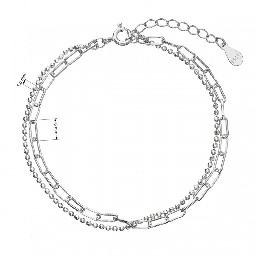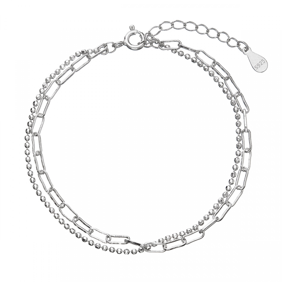 Neschovávajte svoje zápästie pod dlhým rukávom, zvýraznite ho moderným strieborným náramkom z dvojitej retiazky v rôznom tvare. Jedna retiazka je v tvare oválnych očiek a druhá guličiek.