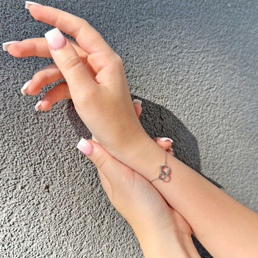 Náramok 13032.1 z dvoch spojených krúžkov zdobený zirkónmi po ich obvode je vyrobený zo striebra rýdzosti 925/1000, ktoré prešlo povrchovou úpravou ródiom. Ródium chráni šperk proti sčernaniu, zožltnutiu i poškriabaniu. Keďže šperk neobsahuje žiadny prídavok niklu , môžu ho bez obáv nosiť aj alergici.