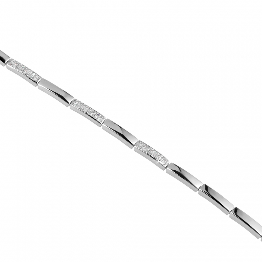 Každý obdĺžnik je starostlivo zasadený a prepojený tak, aby tvoril harmonický celok. Lesklé obdĺžniky priťahujú pozornosť svojou jednoduchosťou a čistotou línií, zatiaľ čo obdĺžniky osadené zirkónmi dodávajú náramku oslnivý ligot. Zirkóny sú starostlivo vybrúsené, zachytávajú svetlo a vytvárajú oslnivé odlesky, ktoré náramku pridávajú na luxuse.