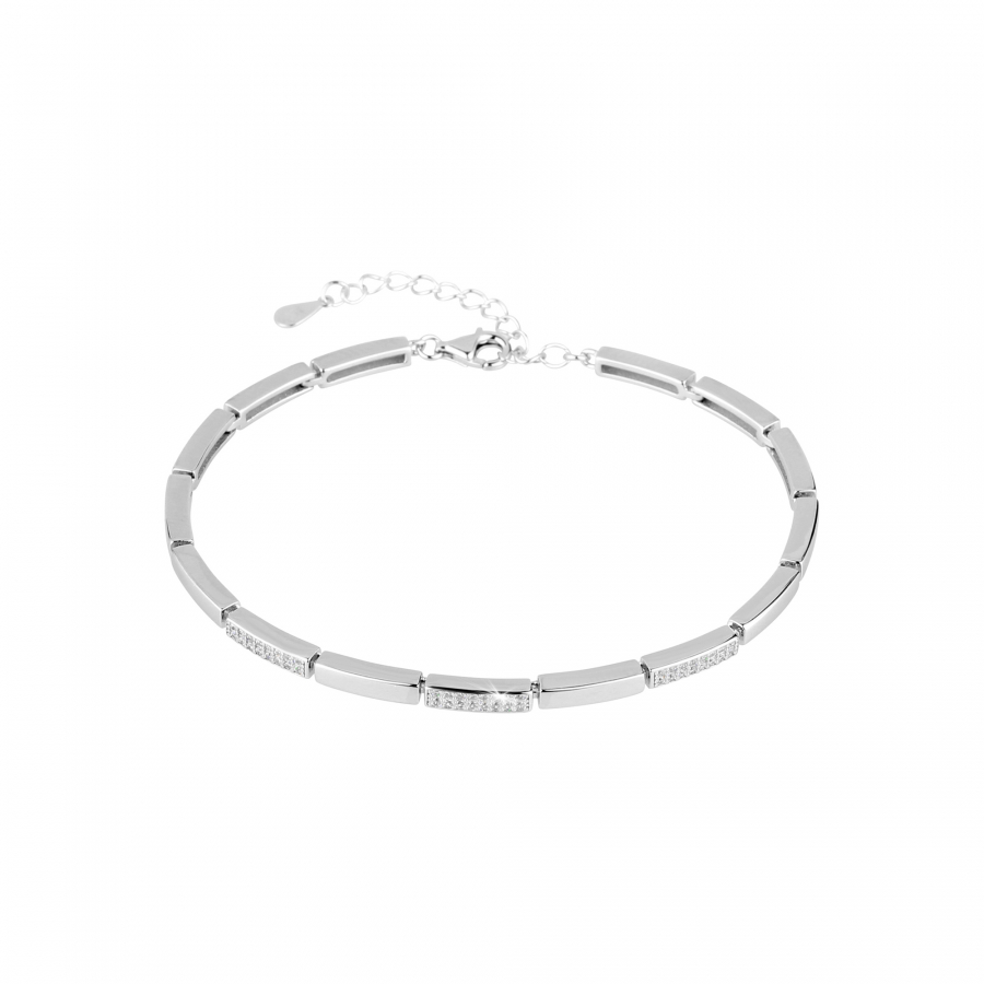 Luxusný strieborný náramok, ktorý kombinuje eleganciu a moderný dizajn, je tvorený z radu lesklých obdĺžnikov a obdĺžnikov osadených zirkónmi.
