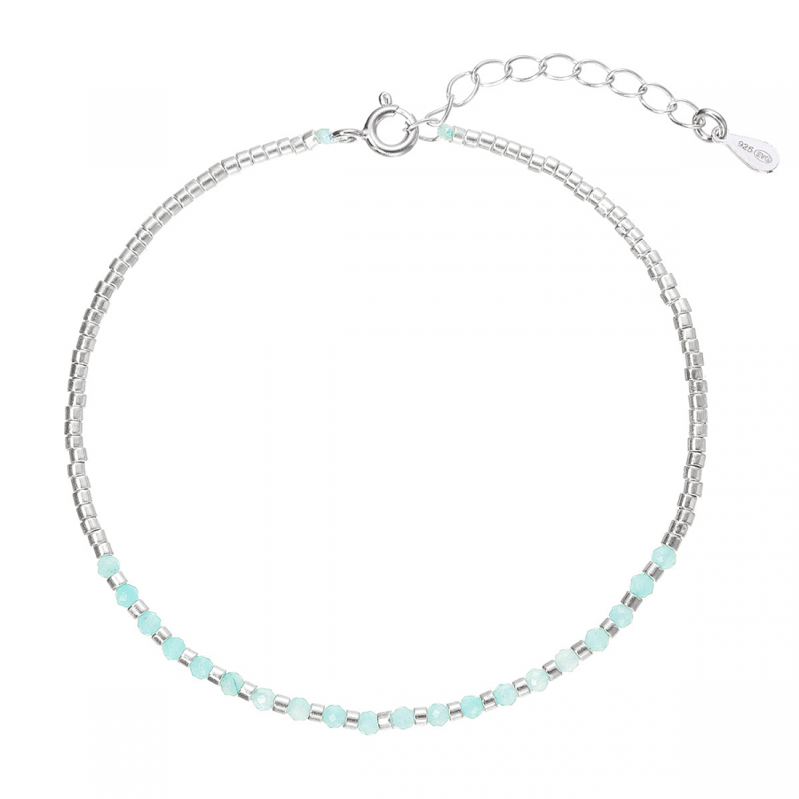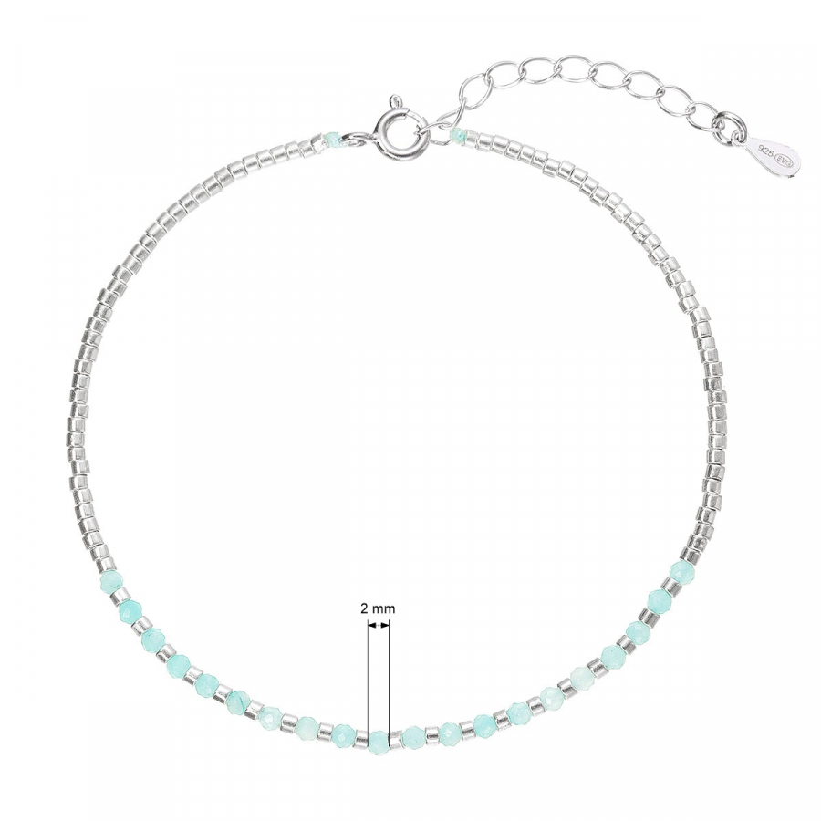 Tento jemný náramok je vyrobený z kvalitného striebra a zdobený pravými amazonitmi. Skladá sa z drobunkých strieborných korálikov, ktoré tvoria väčšinu náramku, a zo sekcie svetlo modrozelených korálikov z amazonitu, ktoré mu dodávajú svieži a elegantný vzhľad.