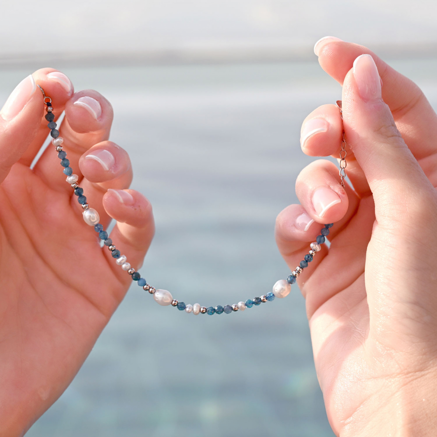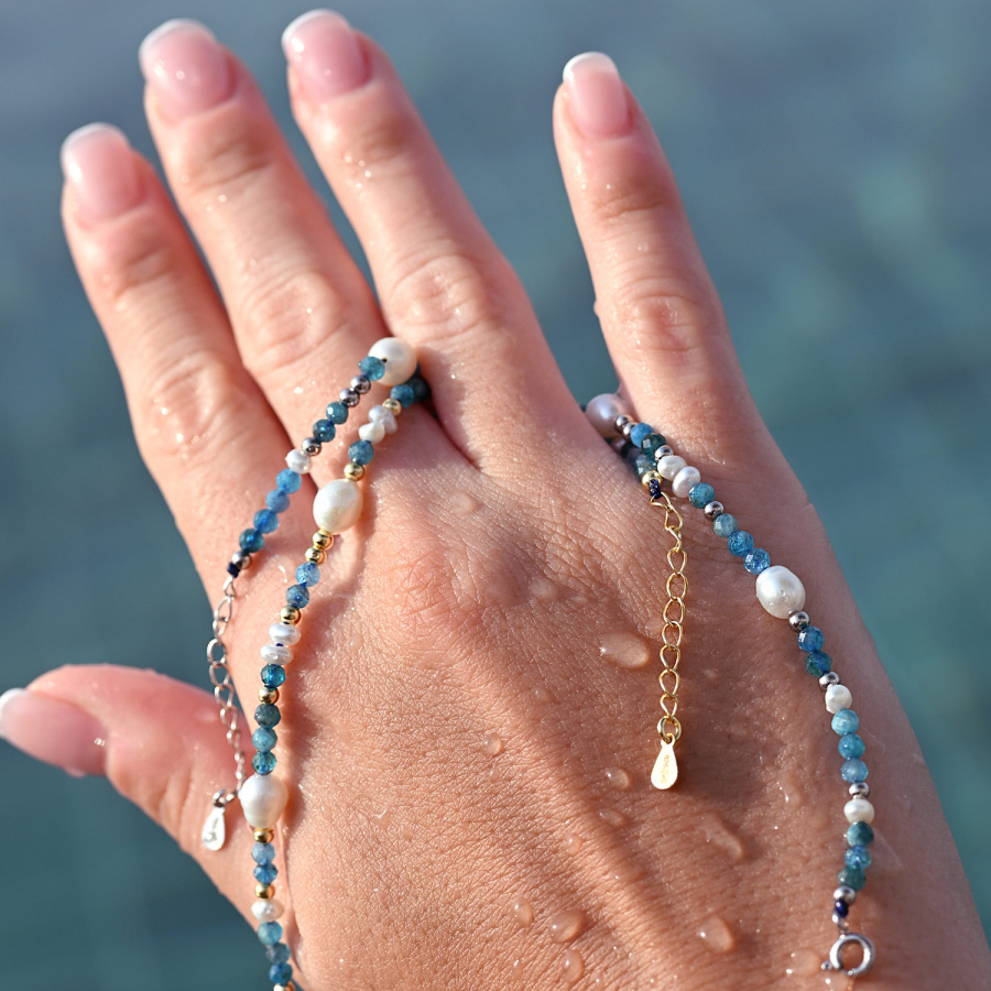 Tento jemný a elegantný náramok je tvorený kombináciou pravých riečnych perál rôznych tvarov a drobných korálikov apatitu v krásnej modrej farbe. Lesklé perly s prirodzeným perleťovým odleskom pôsobia luxusne, zatiaľ čo apatity dodávajú šperku sviežosť a ľahko morský nádych.