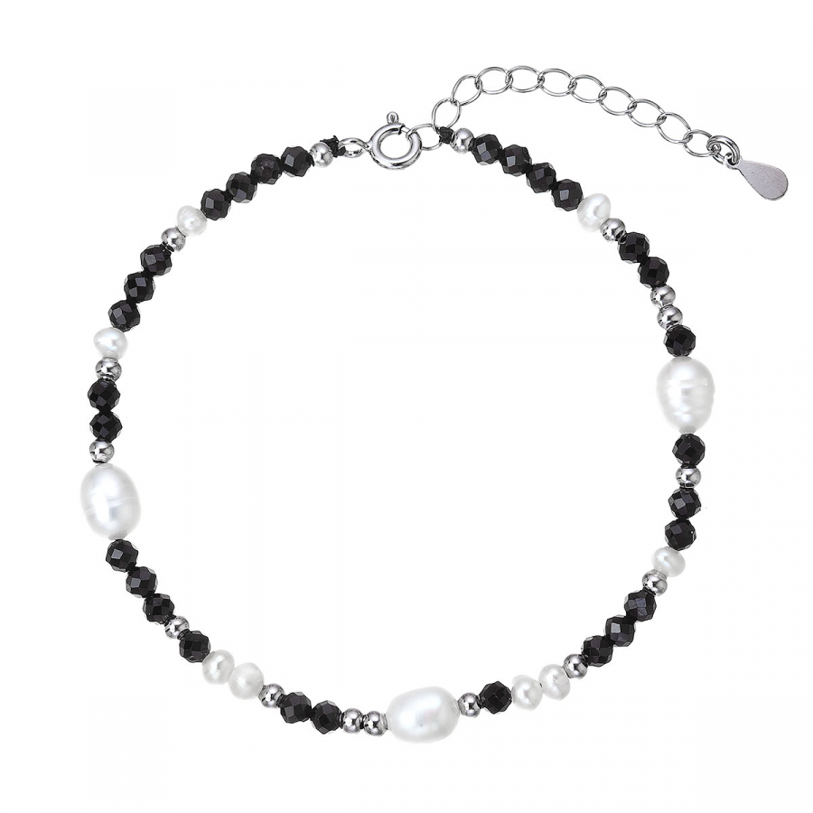 Tento elegantný náramok je tvorený kombináciou pravých čiernych spinelov a pravých bielych riečnych perál rôznych tvarov, ktoré dohromady vytvárajú harmonický a ženský celok. Drobné brúsené spinely sa krásne lesknú a dokonale ladia s prirodzeným perleťovým ligotom perál.