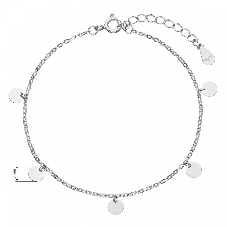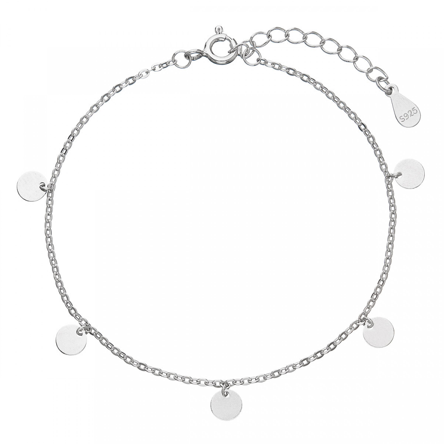 Moderný a elegantný strieborný náramok 63003, je vyrobený z retiazky po obvode ktorej sú malé leštené strieborné placky. Placky majú priemer 5 mm a krásne sa hojdajú na retiazke.
