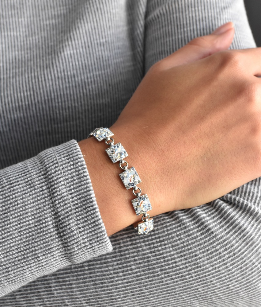 - strieborný náramok zložený zo štvorčekov