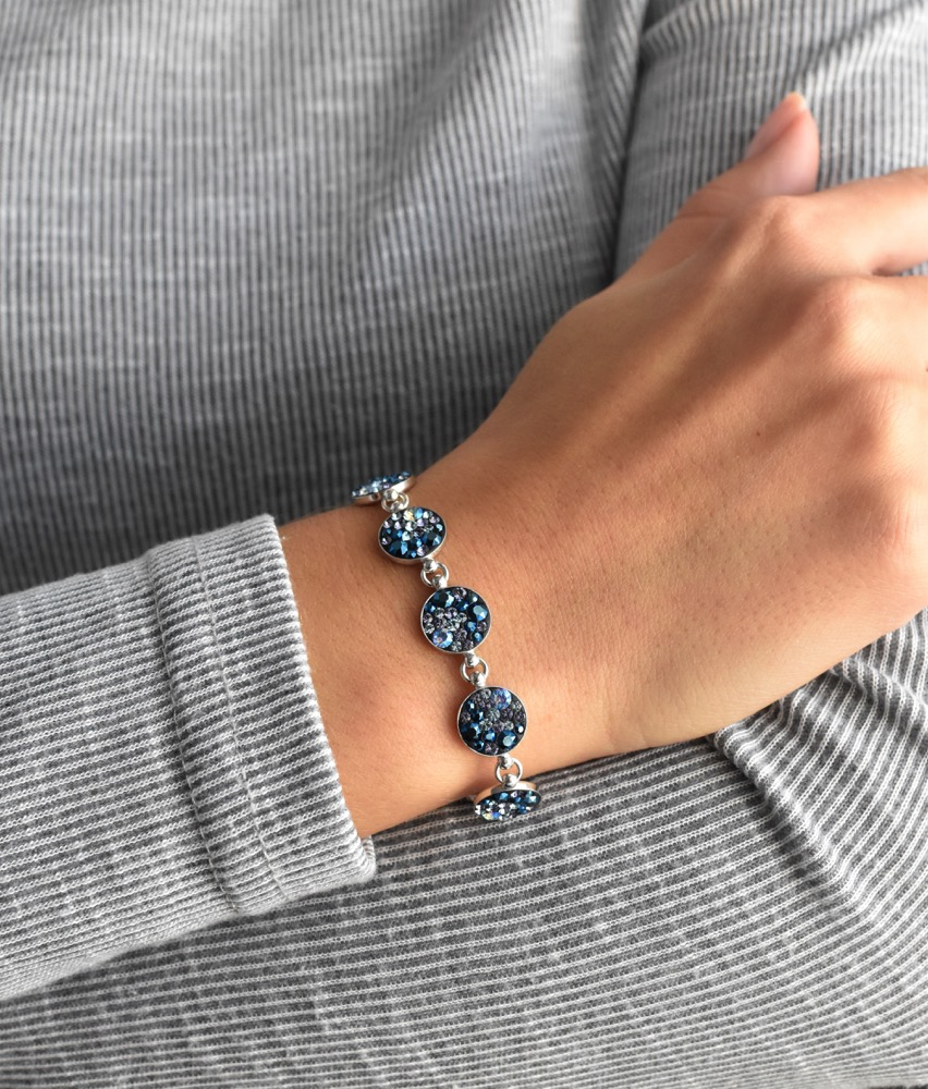 Strieborný náramok 33048.3 blue style je vyrobený zo striebra rýdzosti 925/1000, ktorého povrch bol ošetrený ródiom . Rhodium šperk ochráni proti sčernaniu, zožltnutiu aj poškriabaniu. Náramok je zložený z niekoľkých strieborných koliesok, ktoré sú bohato vysadené Swarovski kryštálmi v rôznych farbách. Keďže náramok neobsahuje prídavok niklu , môžu ho bez obáv z alergickej reakcie nosiť aj alergici.