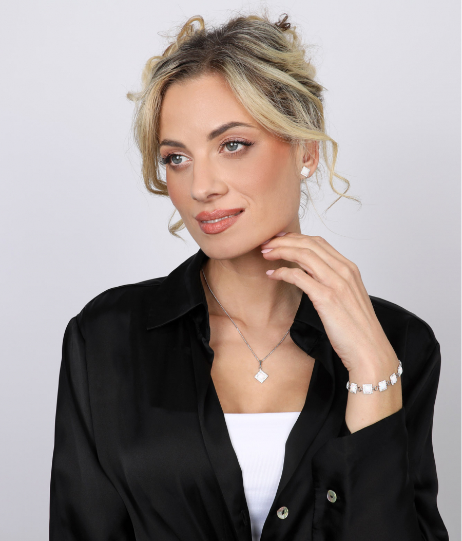 Strieborný náramok 33047.1 je vyrobený zo striebra rýdzosti 925/1000, ktorého povrch bol ošetrený ródiom . Rhodium šperk ochráni proti sčernaniu, zožltnutiu aj poškriabaniu. Náramok je zložený zo strieborných štvorčekov, ktoré sú bohato vysadené Preciosa kryštálmi v bielej farbe a uprostred je štvorcový biely syntetický opál. Keďže náramok neobsahuje prídavok niklu , môžu ho bez obáv z alergickej reakcie nosiť aj alergici.