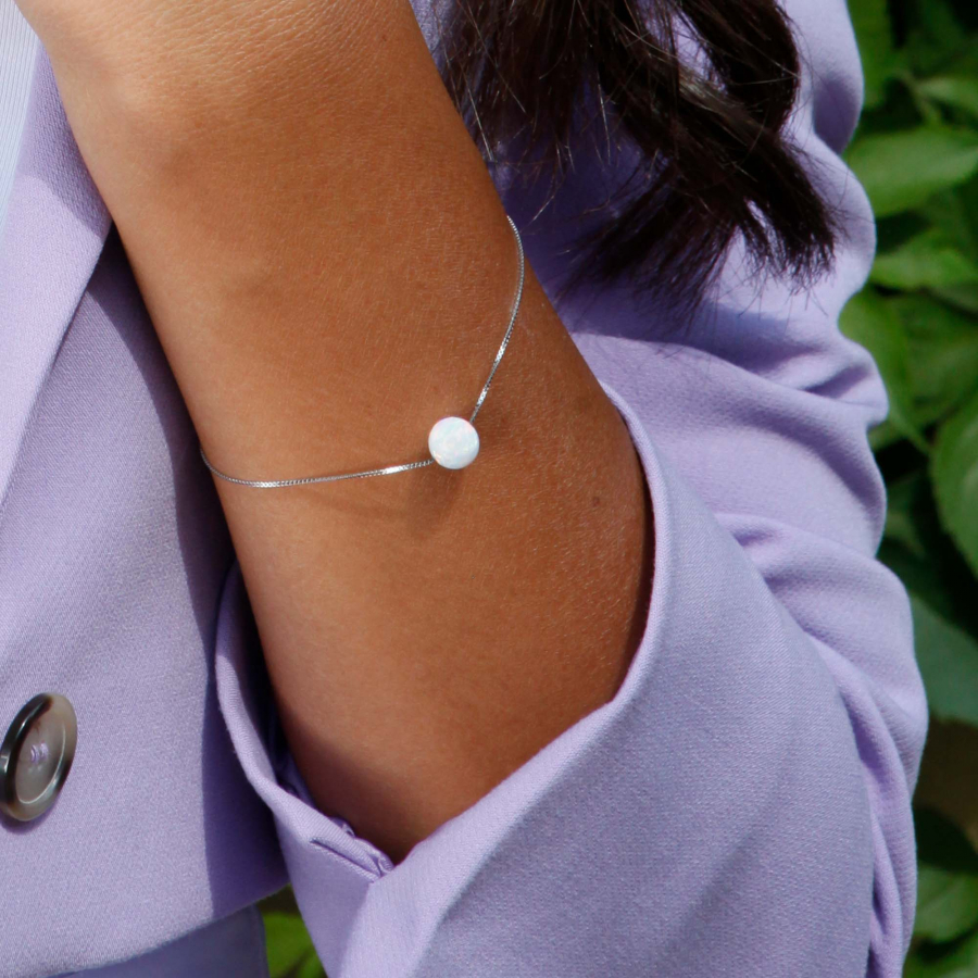 Planétka obiehajúca po obežnej dráhe - tak vyzerá okrúhly opál navlečený na striebornom náramku.