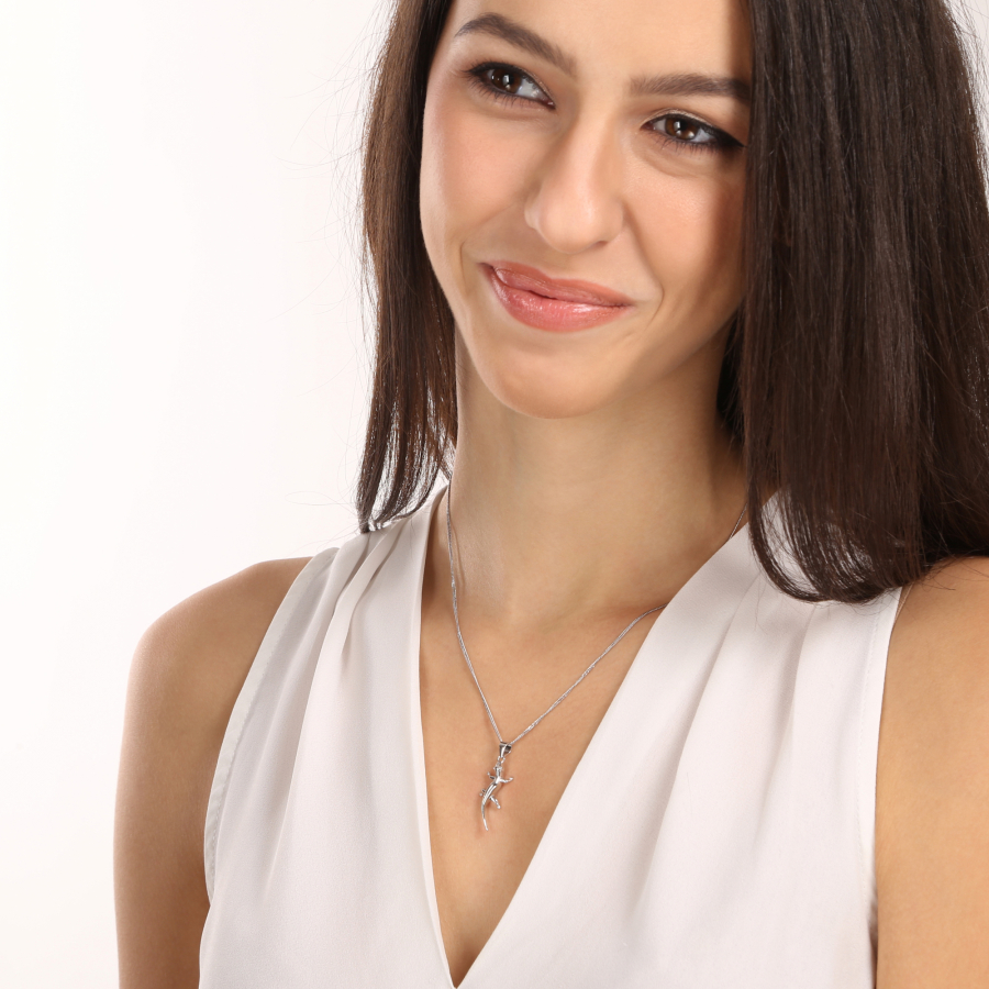 Strieborný prívesok v tvare jašterice zaujme svojim ladným tvarom a jemnými detailmi, ktoré odrážajú jej obratnosť a tajomnú krásu. Jašterica predstavuje silu premeny, odvahu a schopnosť prispôsobiť sa každej situácii. Tento jedinečný šperk svojim ladným tvarom a leskom pritiahne pozornosť a dodá vášmu štýlu výnimočný nádych. Skvelá voľba pre tých, ktorí milujú originalitu, prírodu a rafinovanú symboliku v doplnkoch.