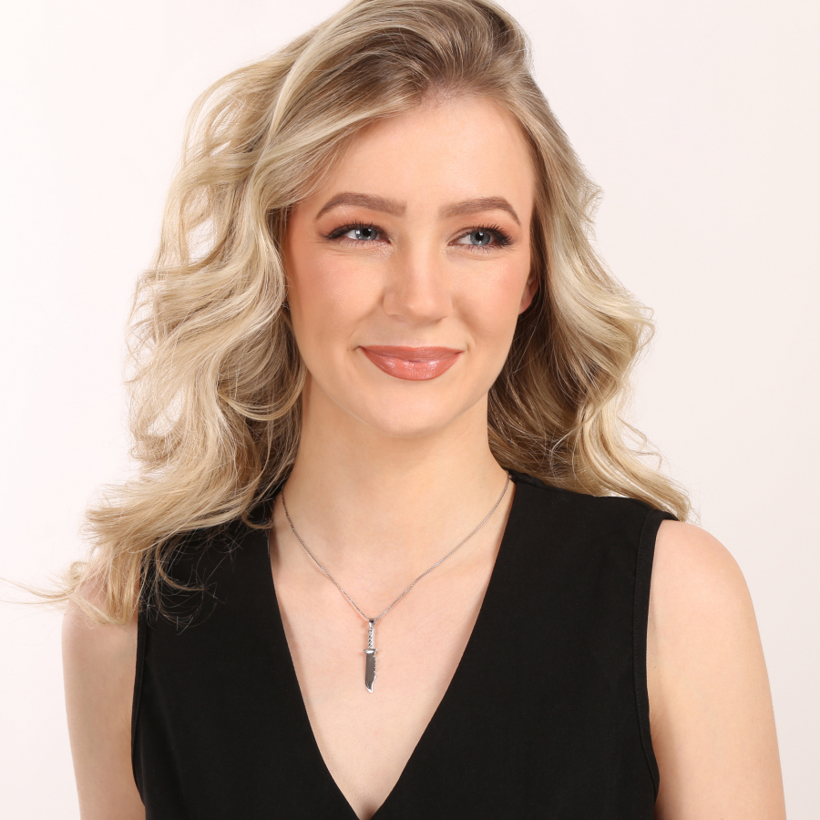 Strieborný prívesok v tvare noža je štýlový a výrazný doplnok pre milovníkov nožov, dobrodružstiev alebo bojových umení. Jeho detailné prevedenie zachytáva elegantný tvar čepele a rukoväte, čím vytvára autentický vzhľad realistickom štýle. Tento prívesok je nielen módnym doplnkom, ale aj symbolizuje silu, odvahu a pripravenosť. Vďaka striebornému materiálu je nadčasový a ľahko sa kombinuje s rôznymi šperkami, hodí sa na každodenné nosenie aj ako originálny darček.