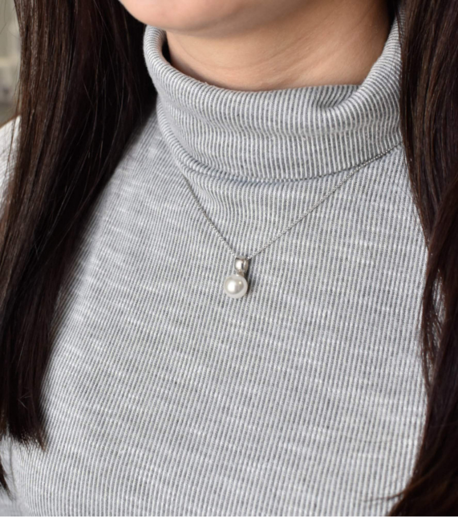 Prívesok 34212.1 je zdobený bielou okrúhlou perlou s priemerom 12 mm. Na prívesok bolo použité striebro rýdzosti 925/1000 , ktorého povrch prešiel úpravou ródiom. Rhodium šperk ochráni proti sčernaniu, zožltnutiu alebo poškriabaniu. Keďže šperk neobsahuje nikel, môžu ho nosiť aj alergici.