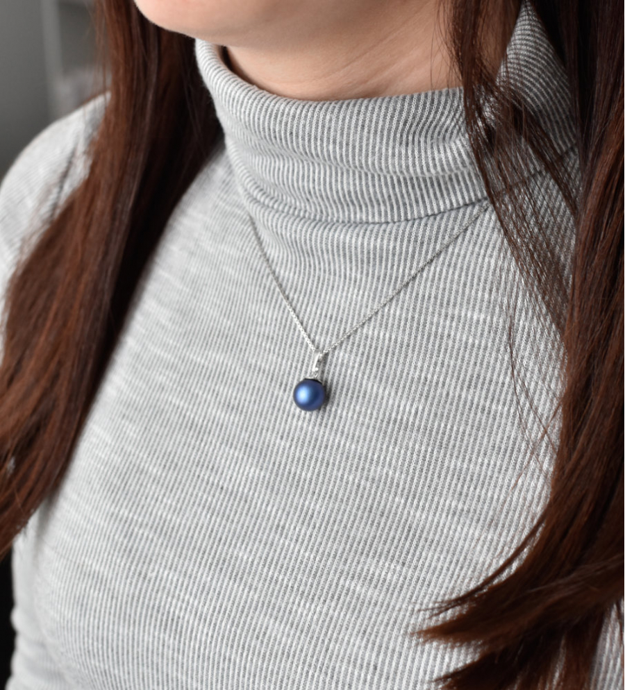 Prívesok je zdobený tmavo modrou matnou Swarovski perlou s priemerom 10 mm. Na prívesok bolo použité striebro rýdzosti 925/1000, ktorého povrch prešiel úpravou ródiom. Rhodium šperk ochráni proti sčernaniu, zožltnutiu alebo poškriabaniu.