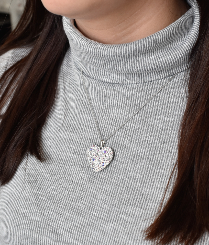 Srdiečko je vysadené Swarovski kryštálmi v bielej farbe s AB efektom.