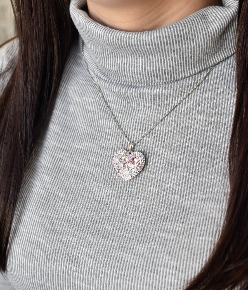 Srdiečko je vysadené Swarovski kryštálmi v ružovej a modrej farbe.