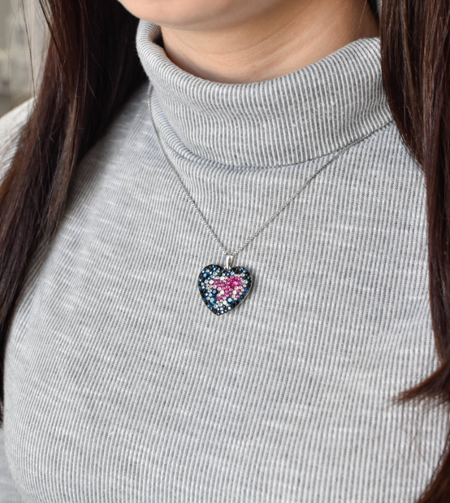 Srdiečko je vysadené Swarovski kryštálmi v ružovej, modrej a čiernej farbe.