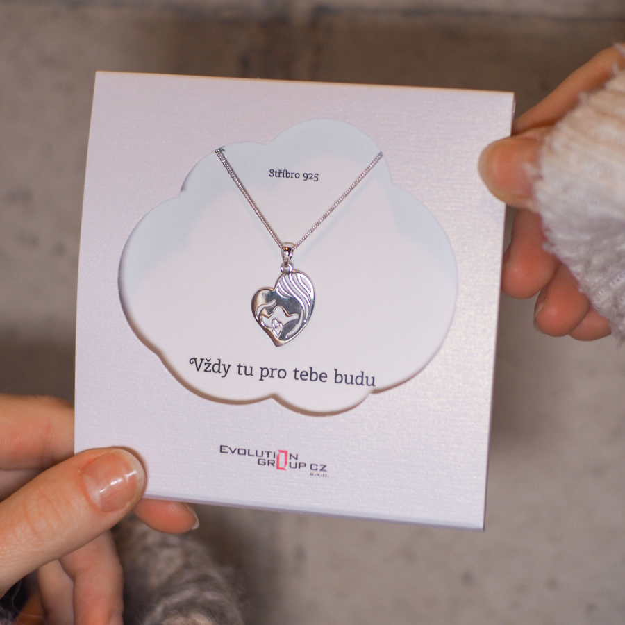 Strieborný prívesok v tvare srdca je zdobený zirkónom bielej farby a symbolizuje matku a dieťa.