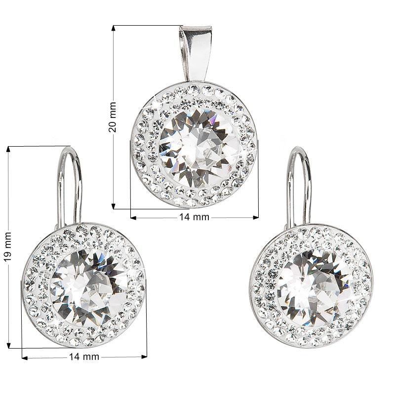 Súprava šperkov 39107.1 obsahuje okrúhle visiace náušnice a prívesok v rovnakej podobe. Šperky sú zdobené veľkým okrúhlym Swarovski kryštálom v bielej farbe, ktorý je navyše lemovaný dvoma radmi menších bielych kryštálov Swarovski. Šperky zo súpravy 39107.1 sú vyrobené zo striebra rýdzosti 925/1000 vrátane povrchovej úpravy ródiom. Ródium chráni šperk proti sčerneniu, zožltnutiu i poškriabaniu. Náušnice majú zapínanie na klapku . Keďže šperky neobsahujú žiadny prídavok niklu , môžu ich bez obáv nosiť aj alergici.