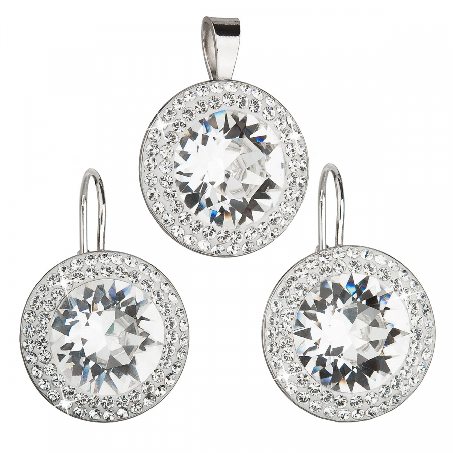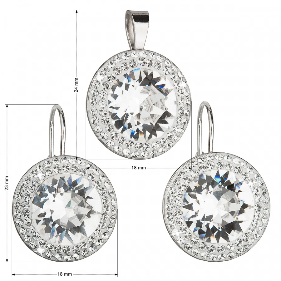 Súprava šperkov 39108.1 obsahuje okrúhle visiace náušnice a prívesok v rovnakej podobe. Šperky sú zdobené veľkým okrúhlym Swarovski kryštálom v bielej farbe, ktorý je navyše lemovaný dvoma radmi menších bielych kryštálov Swarovski. Šperky zo súpravy 39108.1 sú vyrobené zo striebra rýdzosti 925/1000 vrátane povrchovej úpravy ródiom. Ródium chráni šperk proti sčerneniu, zožltnutiu i poškriabaniu. Náušnice majú zapínanie na klapku . Keďže šperky neobsahujú žiadny prídavok niklu , môžu ich bez obáv nosiť aj alergici.