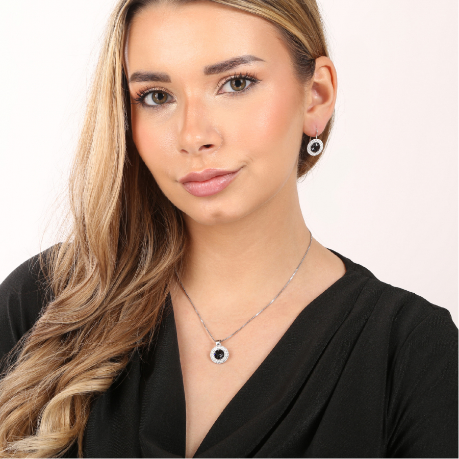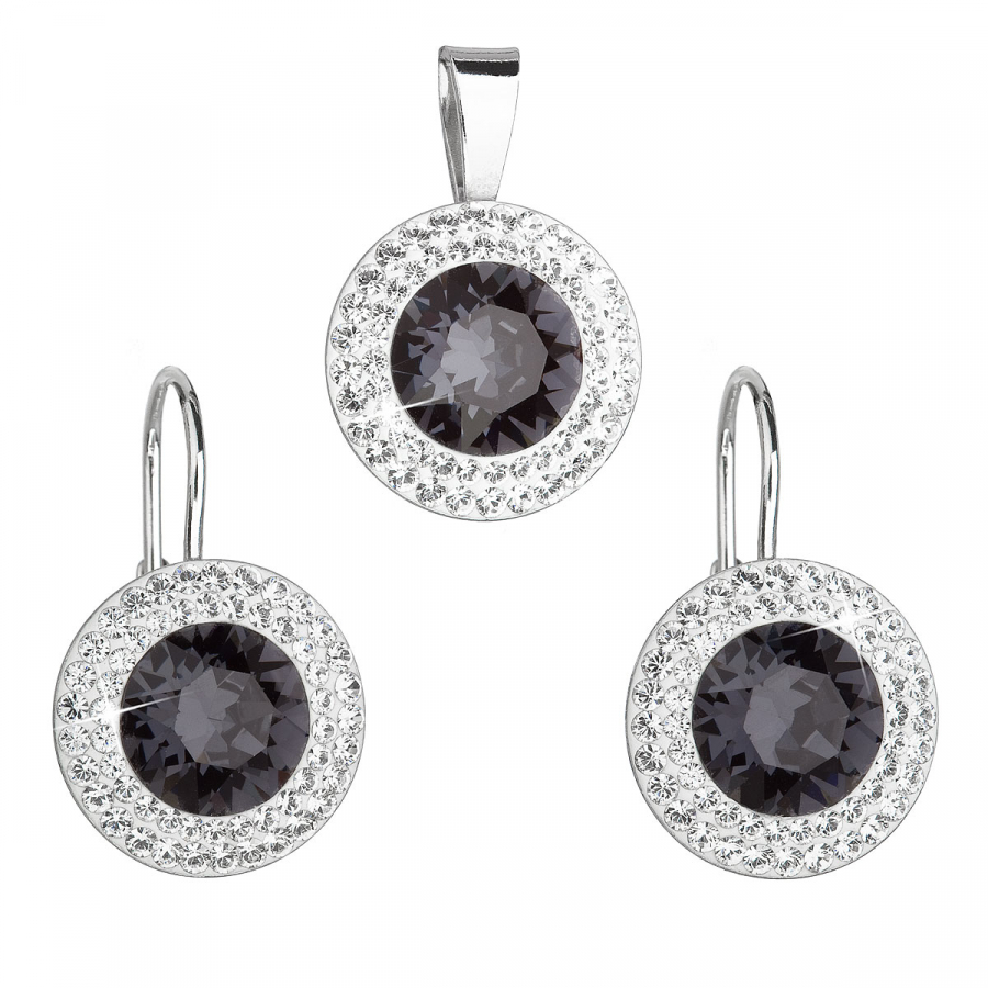 Súprava šperkov 39107.3 obsahuje okrúhle visiace náušnice a prívesok v rovnakej podobe. Šperky sú zdobené veľkým okrúhlym Swarovski kryštálom v čiernej farbe, ktorý je navyše lemovaný dvoma radmi menších bielych kryštálov Swarovski. Šperky zo súpravy 39107.3 sú vyrobené zo striebra rýdzosti 925/1000 vrátane povrchovej úpravy ródiom. Ródium chráni šperk proti sčerneniu, zožltnutiu i poškriabaniu. Náušnice majú zapínanie na klapku . Keďže šperky neobsahujú žiadny prídavok niklu , môžu ich bez obáv nosiť aj alergici.