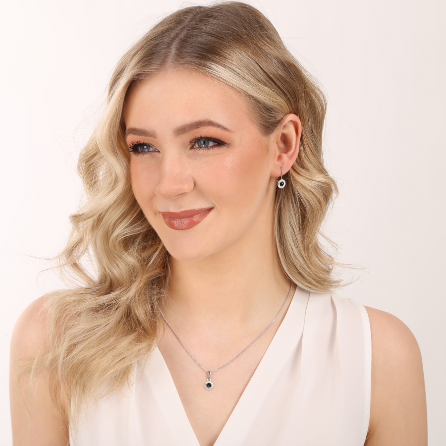Prívesok aj náušnice sú zdobené Swarovski kryštálom čiernej farby , ktorý je olemovaný ešte malými trblietavými Swarovski kryštálmi v bielej farbe. Náušnice majú zapínanie na klapku. Keďže šperky neobsahujú žiadny prídavok niklu , môžu ich bez obáv nosiť aj alergici. Šperky sú vyrobené zo striebra rýdzosti 925/1000, ktoré prešlo povrchovou úpravou ródiom. Ródium chráni šperk proti sčerneniu, zožltnutiu i poškriabaniu.