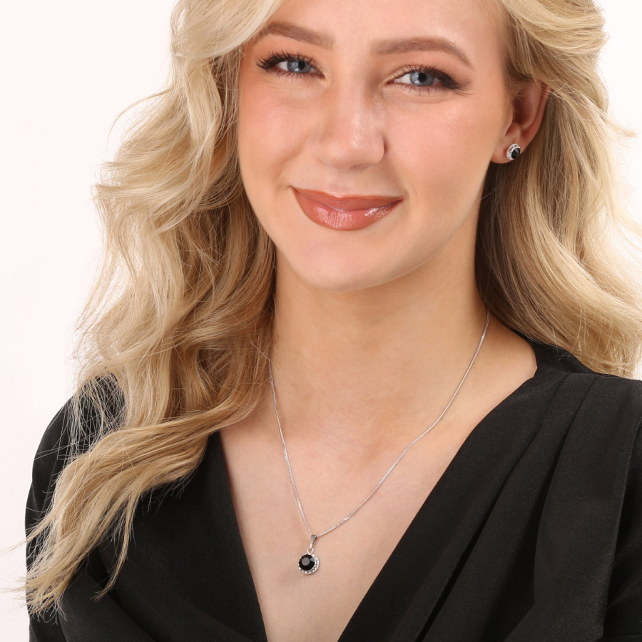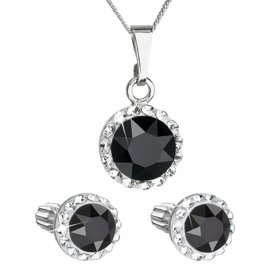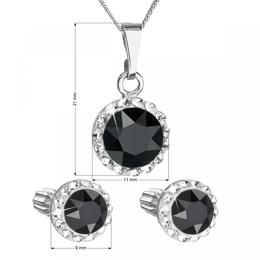 Sada 39352.3 obsahuje náušnice kôstky a retiazku s príveskom. Šperky sú vyrobené zo striebra rýdzosti 925/1000, ktoré prešlo povrchovou úpravou ródiom. Ródium chráni šperk proti sčerneniu, zožltnutiu i poškriabaniu. Prívesok aj náušnice sú zdobené okrúhlym čiernym Swarovski kryštálom , ktorý je navyše olemovaný ešte malými trblietavými Swarovski kryštálmi v bielej farbe. Náušnice majú zapínanie na spoľahlivý balónik. Keďže šperky neobsahujú žiadny prídavok niklu , môžu ich bez obáv nosiť aj alergici.