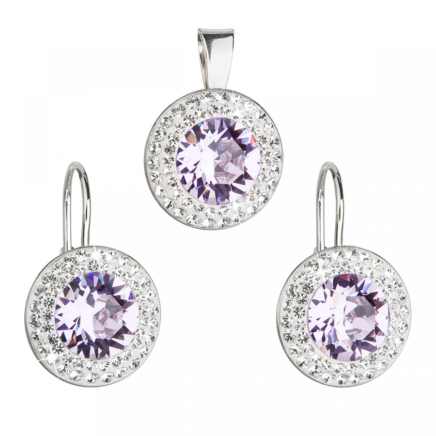 Súprava šperkov 39107.3 obsahuje okrúhle visiace náušnice a prívesok v rovnakej podobe. Šperky sú zdobené veľkým okrúhlym Swarovski kryštálom vo fialovej farbe, ktorý je navyše lemovaný dvoma radmi menších bielych kryštálov Swarovski. Šperky zo súpravy 39107.3 sú vyrobené zo striebra rýdzosti 925/1000 vrátane povrchovej úpravy ródiom. Ródium chráni šperk proti sčerneniu, zožltnutiu i poškriabaniu. Náušnice majú zapínanie na klapku . Keďže šperky neobsahujú žiadny prídavok niklu , môžu ich bez obáv nosiť aj alergici.